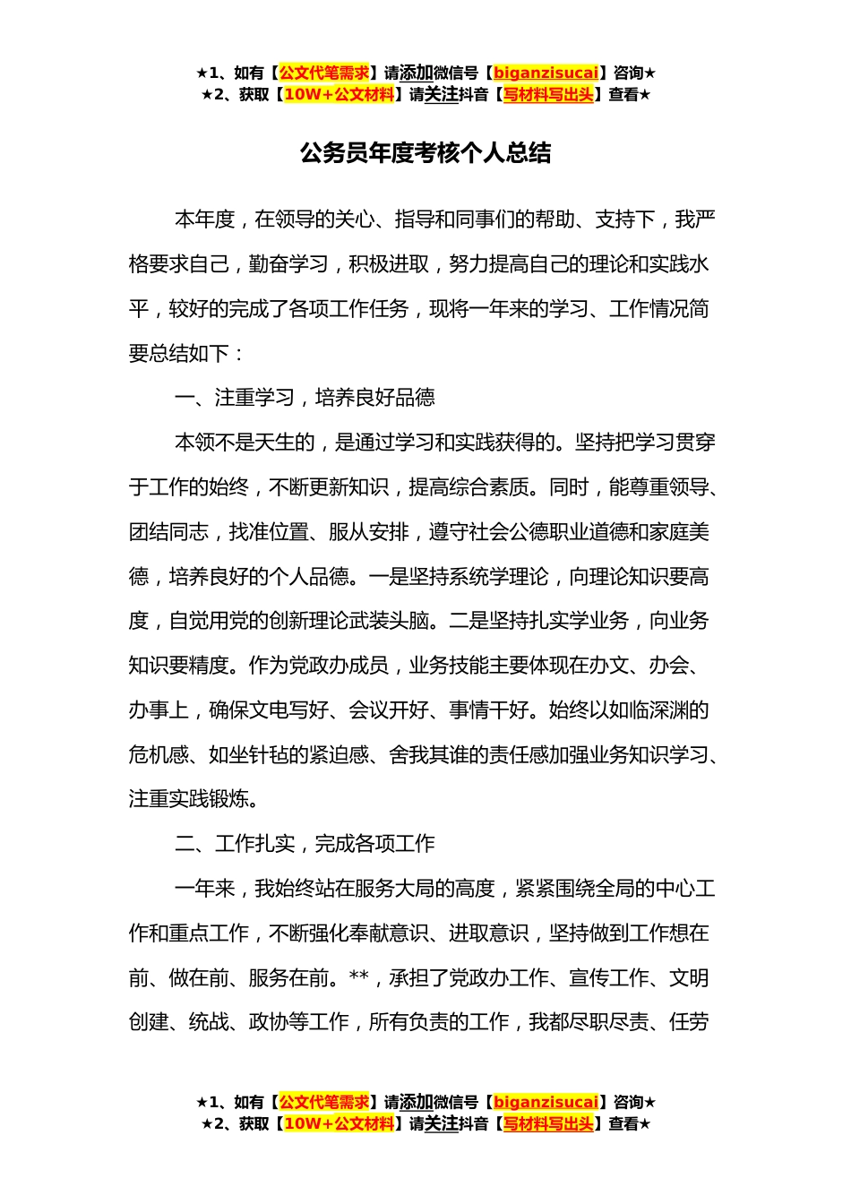 ★1、如有【公文代笔需求】请添加微信号【biganzisucai】咨询★★2、获取【10W+公文材料】请关注抖音【写材料写出头】查看★公务员年度考核个人总结本年度,在领导的关心、指导和同事们的帮助、支持下,我严格要求自己,勤奋学习,积极进取,努力提高自己的理论和实践水平,较好的完成了各项工作任务,现将一年来的学习、工作情况简要总结如下:一、注重学习,培养良好品德本领不是天生的,是通过学习和实践获得的。坚持把学习贯穿于工作的始终,不断更新知识,提高综合素质。同时,能尊重领导、团结同志,找准位置、服从安排,遵守社会公德职业道德和家庭美德,培养良好的个人品德。一是坚持系统学理论,向理论知识要高度,自觉用党的创新理论武装头脑。二是坚持扎实学业务,向业务知识要精度。作为党政办成员,...