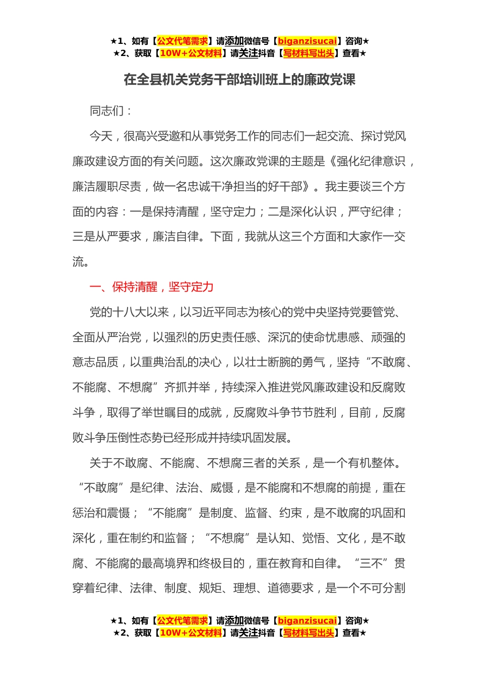 ★1、如有【公文代笔需求】请添加微信号【biganzisucai】咨询★★2、获取【10W+公文材料】请关注抖音【写材料写出头】查看★在全县机关党务干部培训班上的廉政党课同志们:今天,很高兴受邀和从事党务工作的同志们一起交流、探讨党风廉政建设方面的有关问题。这次廉政党课的主题是《强化纪律意识,廉洁履职尽责,做一名忠诚干净担当的好干部》。我主要谈三个方面的内容:一是保持清醒,坚守定力;二是深化认识,严守纪律;三是从严要求,廉洁自律。下面,我就从这三个方面和大家作一交流。一、保持清醒,坚守定力党的十八大以来,以习近平同志为核心的党中央坚持党要管党、全面从严治党,以强烈的历史责任感、深沉的使命忧患感、顽强的意志品质,以重典治乱的决心,以壮士断腕的勇气,坚持“不敢腐、不能腐、不想...