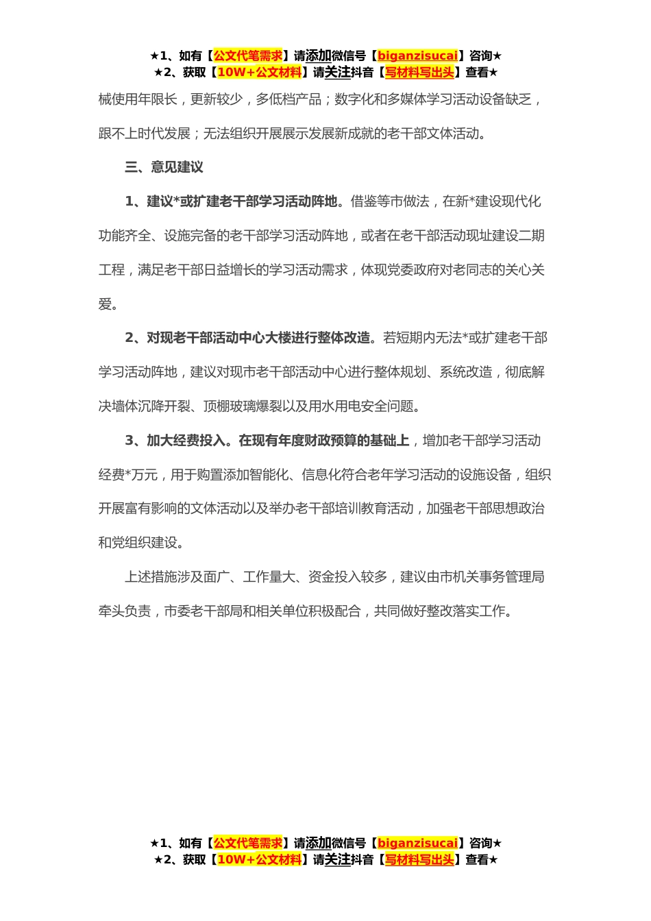 ★1、如有【公文代笔需求】请添加微信号【biganzisucai】咨询★★2、获取【10W+公文材料】请关注抖音【写材料写出头】查看★一、基本情况市老干部活动中心大楼于年建成并投入使用,占地亩,建筑面积㎡,现大楼由市老干部活动(服务)中心、第二老年大学、市级机关医院宣武门诊部三家共用,市活动中心实际使用面积约**㎡。老干部活动中心承担着上级有关老干部工作方针、政策贯彻落实的重要任务,是组织老干部理论学习,开展各种文体活动的重要场所。目前,我市老干部活动中心日活动量(含第二老年大学)达**人次。二、目前存在的主要问题多年来,市老干部活动中心牢牢把握正确政治方向,把思想政治教育寓于各项学习活动之中,弘扬主旋律,用心用情为老同志做好服务保障工作,但随着社会的进步,老同志精神文化需求...