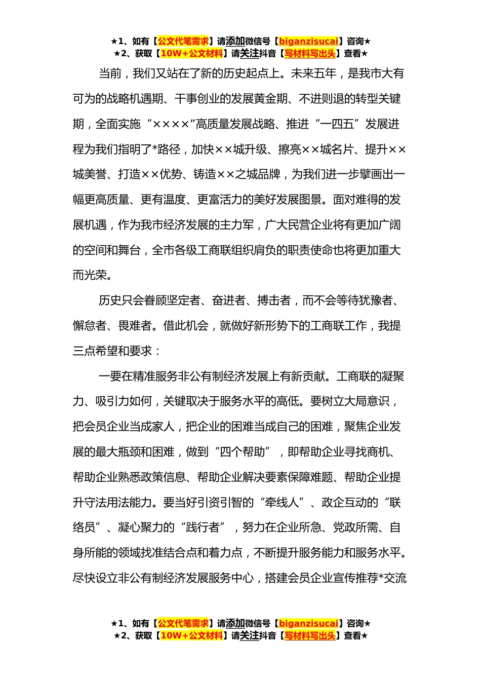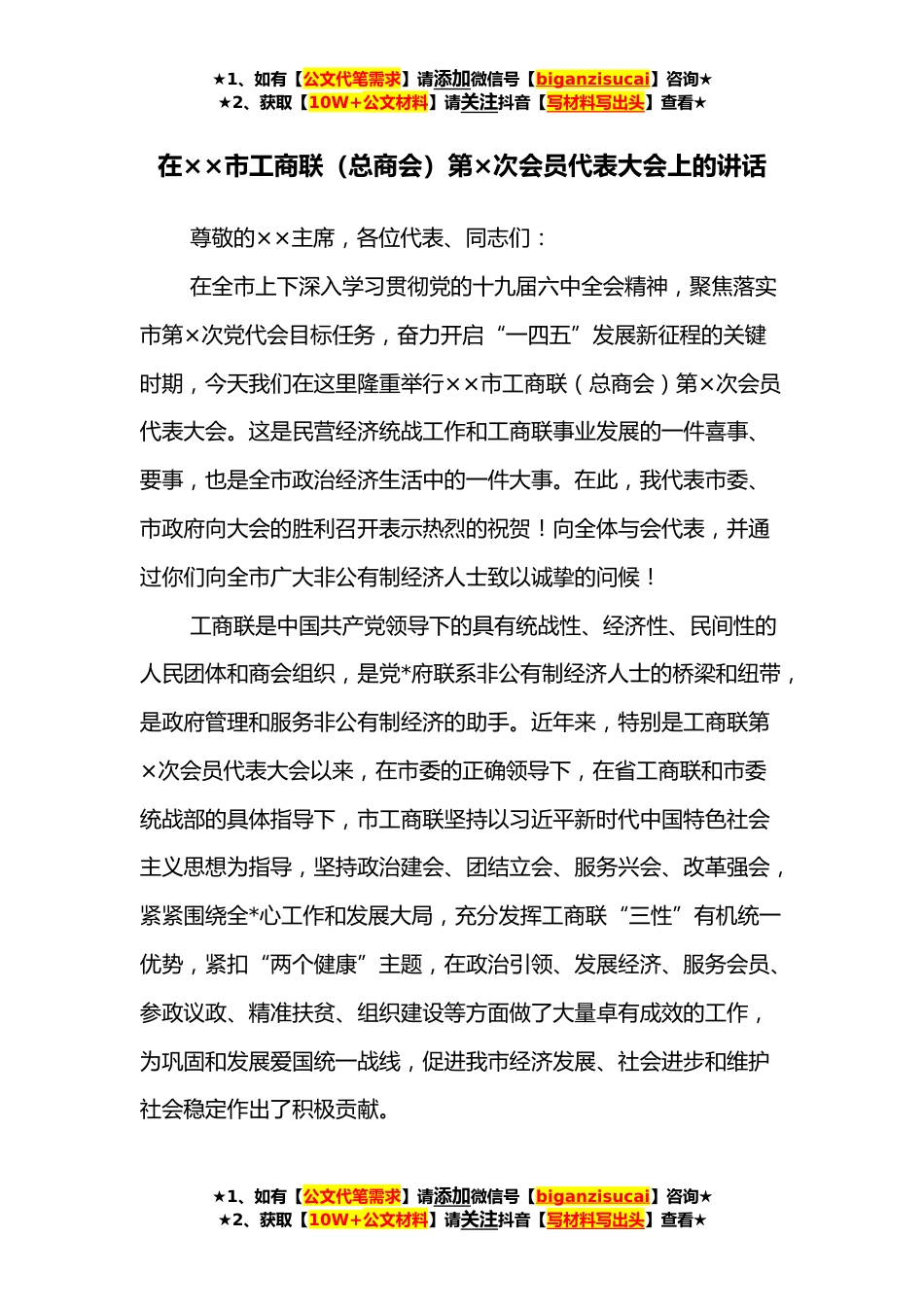 ★1、如有【公文代笔需求】请添加微信号【biganzisucai】咨询★★2、获取【10W+公文材料】请关注抖音【写材料写出头】查看★在××市工商联(总商会)第×次会员代表大会上的讲话尊敬的××主席,各位代表、同志们:在全市上下深入学习贯彻党的十九届六中全会精神,聚焦落实市第×次党代会目标任务,奋力开启“一四五”发展新征程的关键时期,今天我们在这里隆重举行××市工商联(总商会)第×次会员代表大会。这是民营经济统战工作和工商联事业发展的一件喜事、要事,也是全市政治经济生活中的一件大事。在此,我代表市委、市政府向大会的胜利召开表示热烈的祝贺!向全体与会代表,并通过你们向全市广大非公有制经济人士致以诚挚的问候!工商联是中国共产党领导下的具有统战性、经济性、民间性的人民团体和商会...