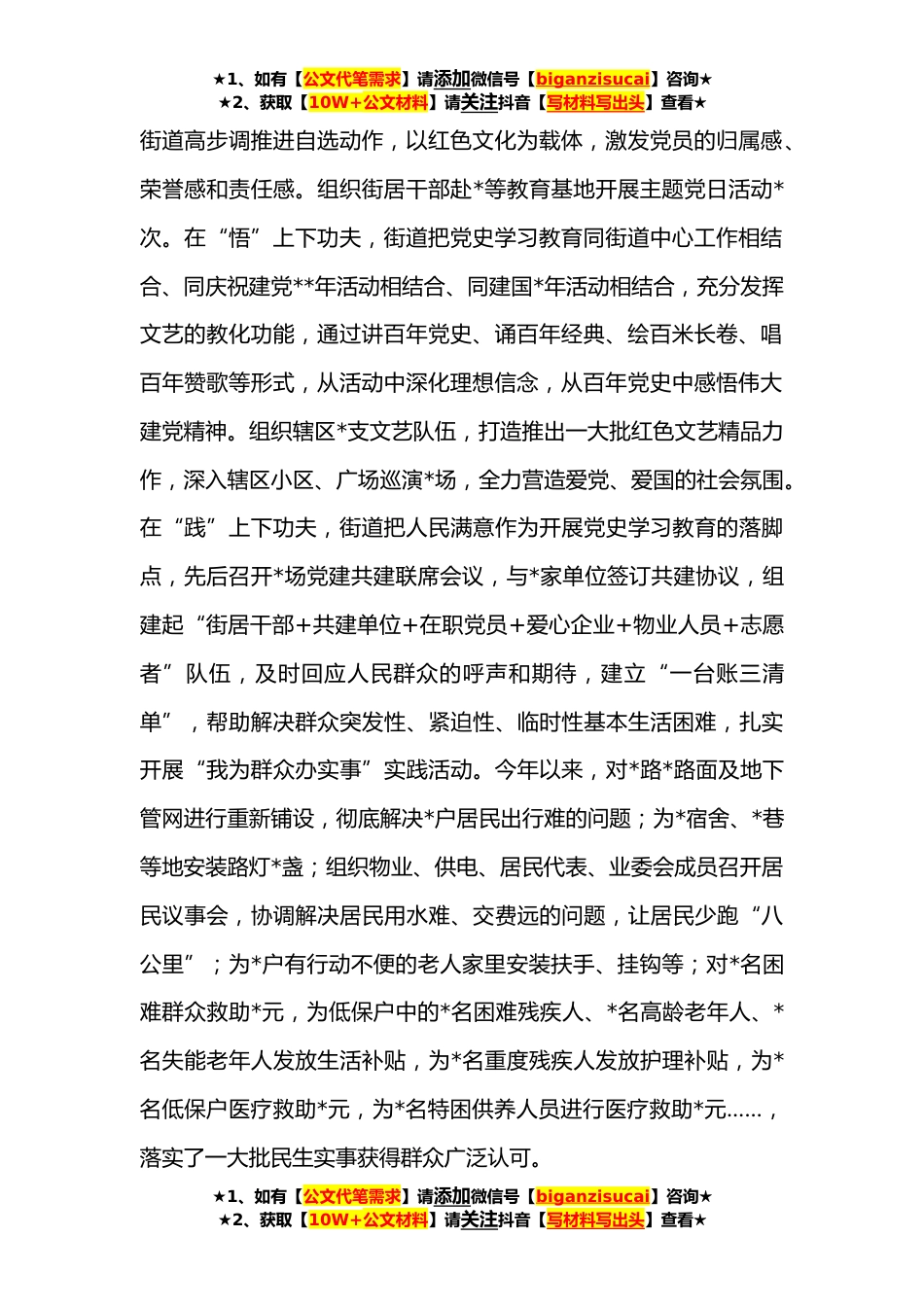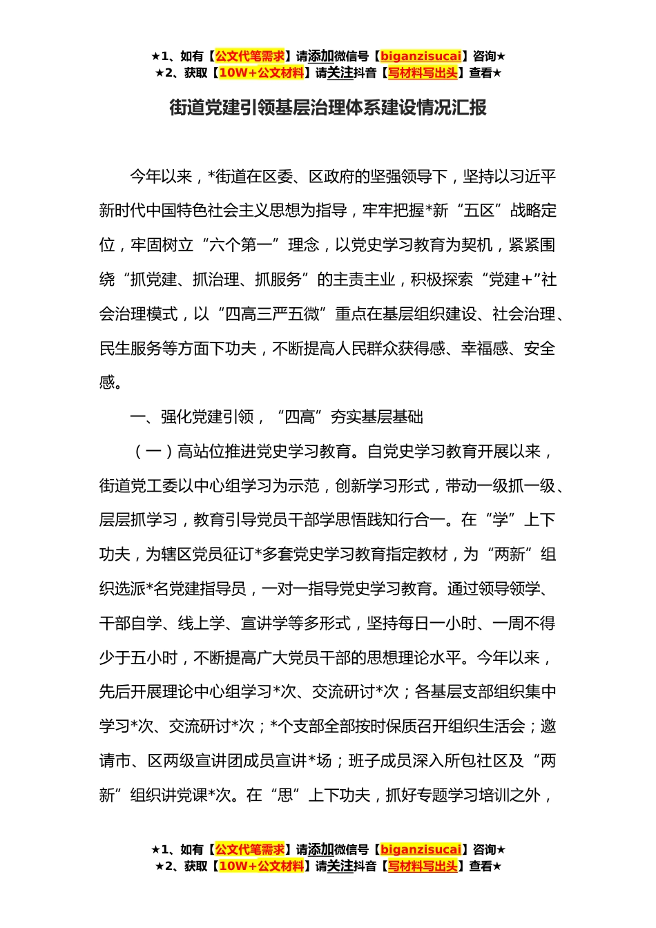 ★1、如有【公文代笔需求】请添加微信号【biganzisucai】咨询★★2、获取【10W+公文材料】请关注抖音【写材料写出头】查看★街道党建引领基层治理体系建设情况汇报今年以来,*街道在区委、区政府的坚强领导下,坚持以习近平新时代中国特色社会主义思想为指导,牢牢把握*新“五区”战略定位,牢固树立“六个第一”理念,以党史学习教育为契机,紧紧围绕“抓党建、抓治理、抓服务”的主责主业,积极探索“党建+”社会治理模式,以“四高三严五微”重点在基层组织建设、社会治理、民生服务等方面下功夫,不断提高人民群众获得感、幸福感、安全感。一、强化党建引领,“四高”夯实基层基础(一)高站位推进党史学习教育。自党史学习教育开展以来,街道党工委以中心组学习为示范,创新学习形式,带动一级抓一级、层层抓...