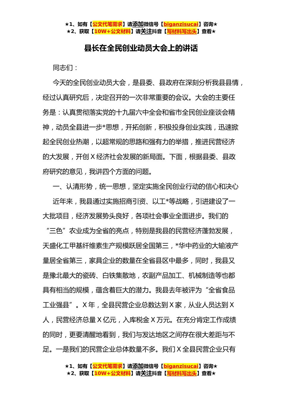 ★1、如有【公文代笔需求】请添加微信号【biganzisucai】咨询★★2、获取【10W+公文材料】请关注抖音【写材料写出头】查看★县长在全民创业动员大会上的讲话同志们:今天的全民创业动员大会,是县委、县政府在深刻分析我县县情,经过认真研究后,决定召开的一次非常重要的会议。大会的主要任务是:认真贯彻落实党的十九届六中全会和省市全民创业座谈会精神,动员全县进一步*思想,开拓创新,积极投身创业实践,迅速掀起全民创业热潮,以超常规的思路和强有力的举措,推进民营经济的大发展,开创X经济社会发展的新局面。下面,根据县委、县政府研究的意见,我讲四个方面的问题。一、认清形势,统一思想,坚定实施全民创业行动的信心和决心近年来,我县通过实施招商引资、以工*等战略,引进建设了一大批项目,经济发...