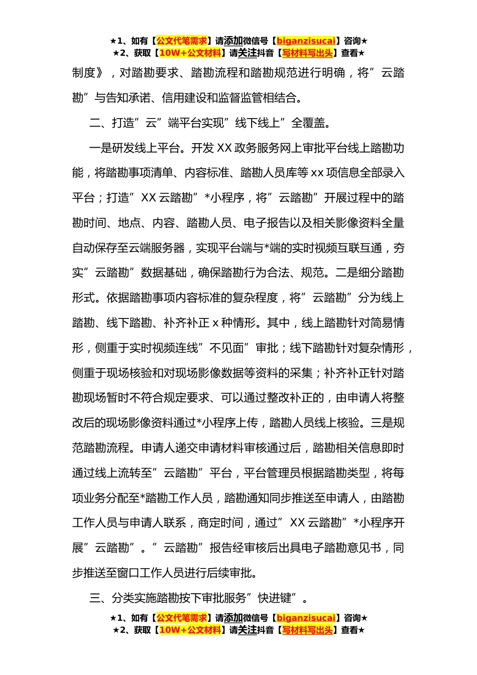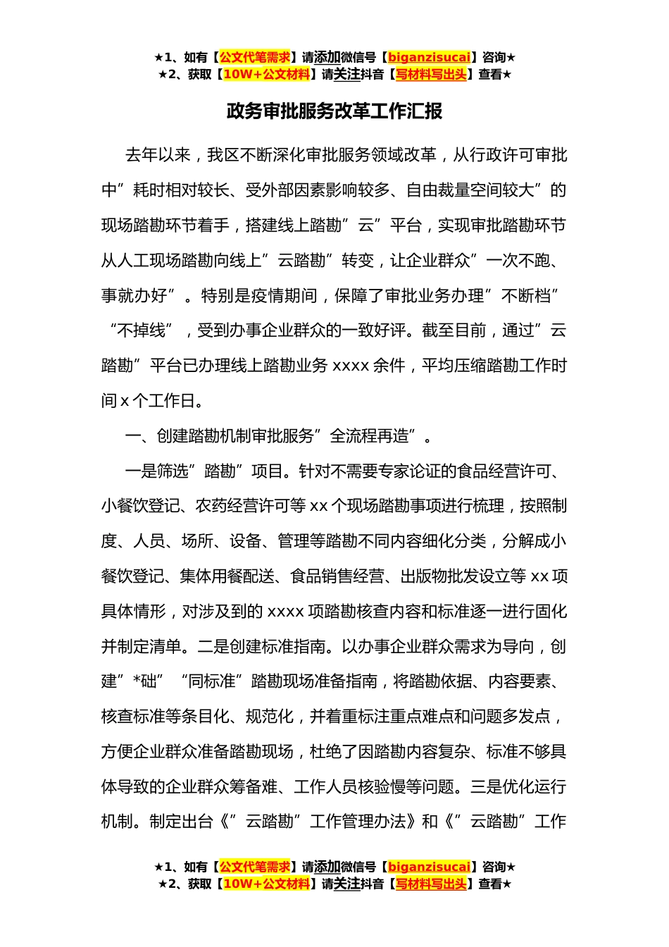 ★1、如有【公文代笔需求】请添加微信号【biganzisucai】咨询★★2、获取【10W+公文材料】请关注抖音【写材料写出头】查看★政务审批服务改革工作汇报去年以来,我区不断深化审批服务领域改革,从行政许可审批中”耗时相对较长、受外部因素影响较多、自由裁量空间较大”的现场踏勘环节着手,搭建线上踏勘”云”平台,实现审批踏勘环节从人工现场踏勘向线上”云踏勘”转变,让企业群众”一次不跑、事就办好”。特别是疫情期间,保障了审批业务办理”不断档”“不掉线”,受到办事企业群众的一致好评。截至目前,通过”云踏勘”平台已办理线上踏勘业务xxxx余件,平均压缩踏勘工作时间x个工作日。一、创建踏勘机制审批服务”全流程再造”。一是筛选”踏勘”项目。针对不需要专家论证的食品经营许可、小餐饮登记、农药...