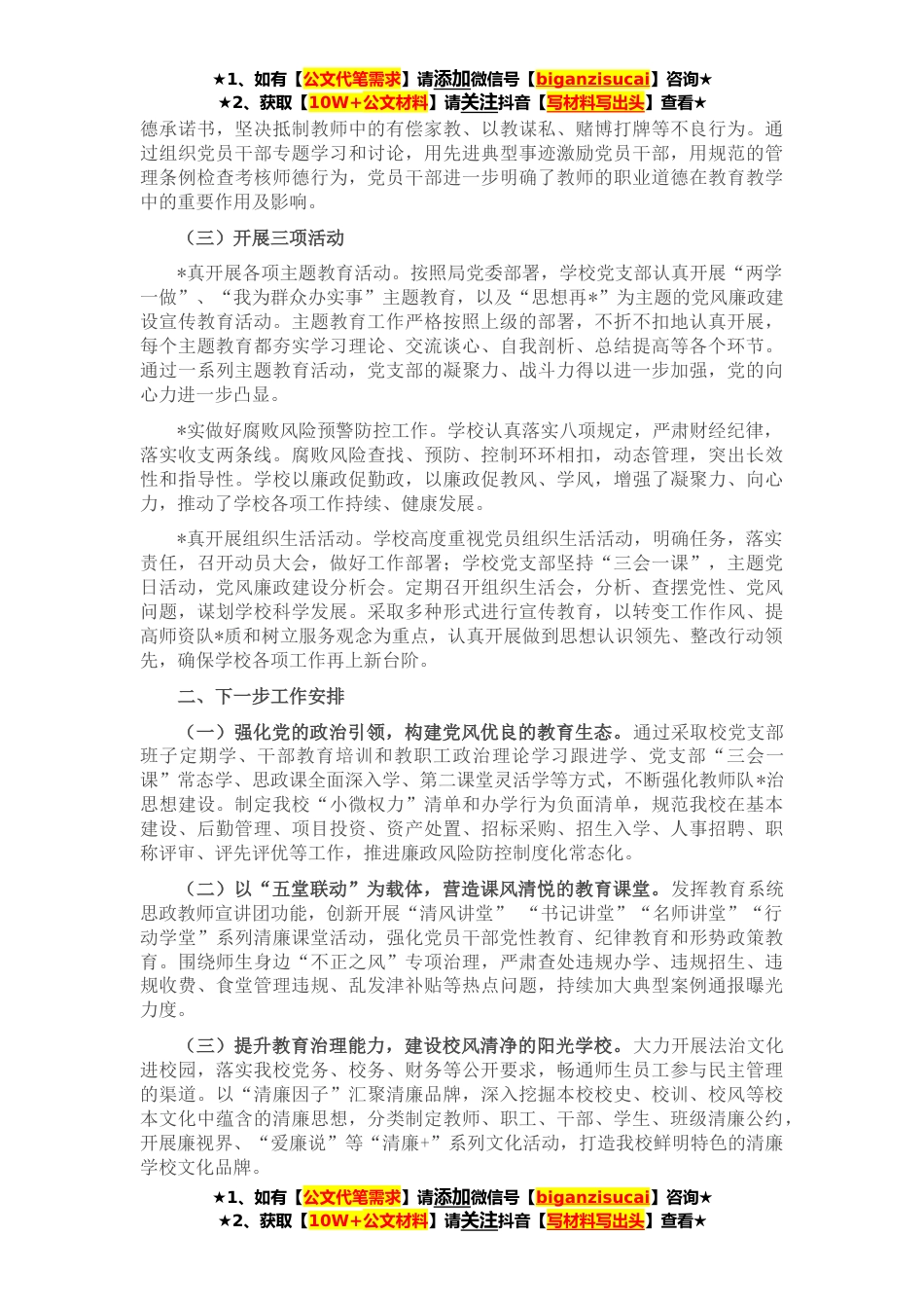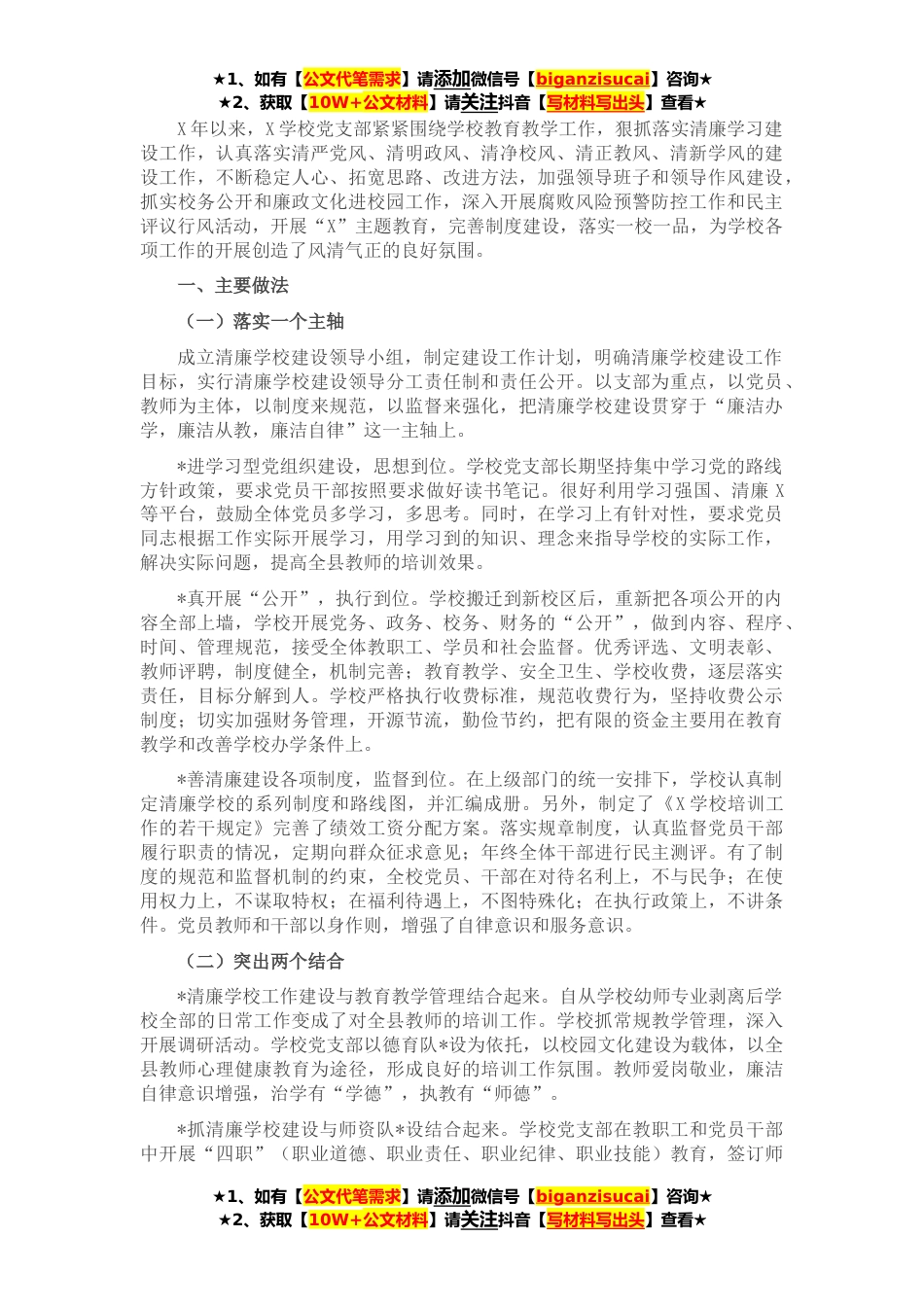 ★1、如有【公文代笔需求】请添加微信号【biganzisucai】咨询★★2、获取【10W+公文材料】请关注抖音【写材料写出头】查看★X年以来,X学校党支部紧紧围绕学校教育教学工作,狠抓落实清廉学习建设工作,认真落实清严党风、清明政风、清净校风、清正教风、清新学风的建设工作,不断稳定人心、拓宽思路、改进方法,加强领导班子和领导作风建设,抓实校务公开和廉政文化进校园工作,深入开展腐败风险预警防控工作和民主评议行风活动,开展“X”主题教育,完善制度建设,落实一校一品,为学校各项工作的开展创造了风清气正的良好氛围。一、主要做法(一)落实一个主轴成立清廉学校建设领导小组,制定建设工作计划,明确清廉学校建设工作目标,实行清廉学校建设领导分工责任制和责任公开。以支部为重点,以党员、教师为...