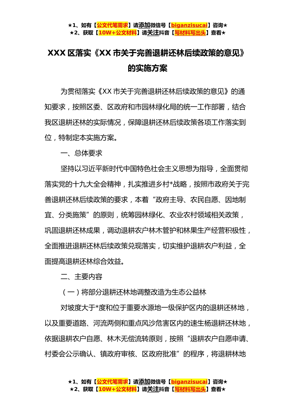 ★1、如有【公文代笔需求】请添加微信号【biganzisucai】咨询★★2、获取【10W+公文材料】请关注抖音【写材料写出头】查看★XXX区落实《XX市关于完善退耕还林后续政策的意见》的实施方案为贯彻落实《XX市关于完善退耕还林后续政策的意见》的通知要求,按照区委、区政府和市园林绿化局的统一工作部署,结合我区退耕还林的实际情况,保障退耕还林后续政策各项工作落实到位,特制定本实施方案。一、总体要求坚持以习近平新时代中国特色社会主义思想为指导,全面贯彻落实党的十九大全会精神,扎实推进乡村*战略,按照市政府关于完善退耕还林后续政策的要求,本着“政府主导、农民自愿、因地制宜、分类施策”的原则,统筹园林绿化、农业农村领域相关政策,巩固退耕还林成果,调动退耕农户林木管护和林果生产经营积极性...