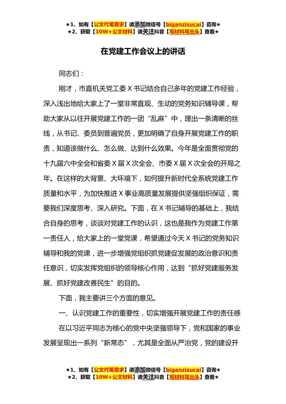 ★1、如有【公文代笔需求】请添加微信号【biganzisucai】咨询★★2、获取【10W+公文材料】请关注抖音【写材料写出头】查看★在党建工作会议上的讲话同志们:刚才,市直机关党工委X书记结合自己多年的党建工作经验,深入浅出地给大家上了一堂非常直观、生动的党务知识辅导课,帮助大家从以往开展党建工作的一团“乱麻”中,理出一条清晰的丝线,从书记、委员到普遍党员,更加明确了自身开展党建工作的职责,知道该做什么、怎么做、达到什么效果。今年是全面贯彻党的十九届六中全会和省委X届X次全会、市委X届X次全会的开局之年。在这样的大背景、大环境下,如何提升新时代全系统党建工作质量和水平,为加快推进X事业高质量发展提供坚强组织保证,需要我们深度思考、深入研究。下面,在X书记辅导的基础上,我结合自身...