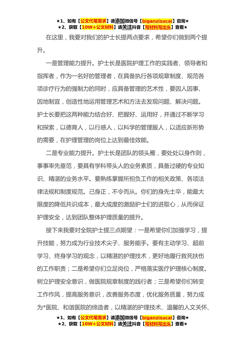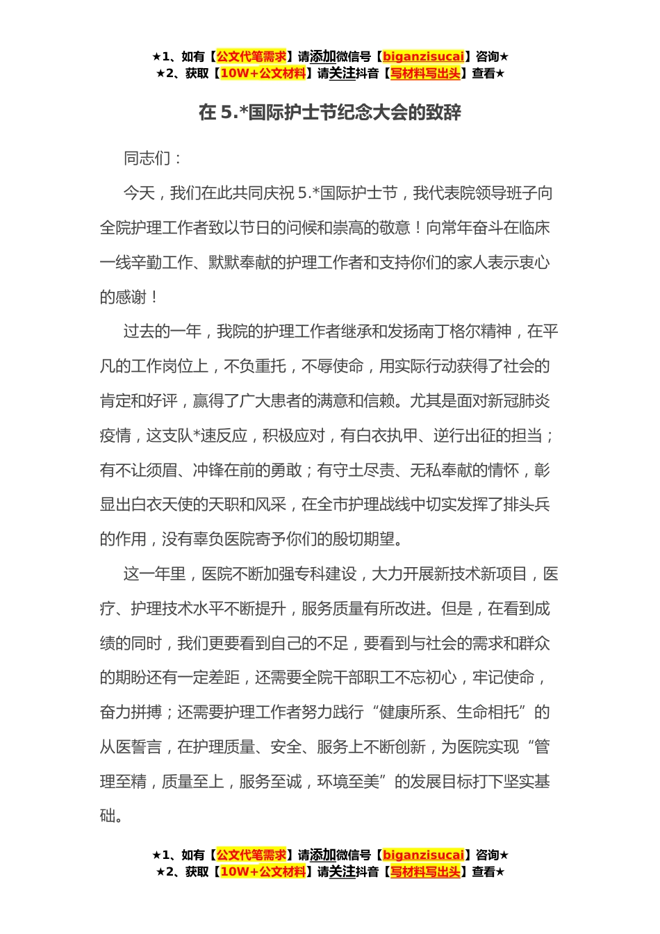 ★1、如有【公文代笔需求】请添加微信号【biganzisucai】咨询★★2、获取【10W+公文材料】请关注抖音【写材料写出头】查看★在5.*国际护士节纪念大会的致辞同志们:今天,我们在此共同庆祝5.*国际护士节,我代表院领导班子向全院护理工作者致以节日的问候和崇高的敬意!向常年奋斗在临床一线辛勤工作、默默奉献的护理工作者和支持你们的家人表示衷心的感谢!过去的一年,我院的护理工作者继承和发扬南丁格尔精神,在平凡的工作岗位上,不负重托,不辱使命,用实际行动获得了社会的肯定和好评,赢得了广大患者的满意和信赖。尤其是面对新冠肺炎疫情,这支队*速反应,积极应对,有白衣执甲、逆行出征的担当;有不让须眉、冲锋在前的勇敢;有守土尽责、无私奉献的情怀,彰显出白衣天使的天职和风采,在全市护理战线中...