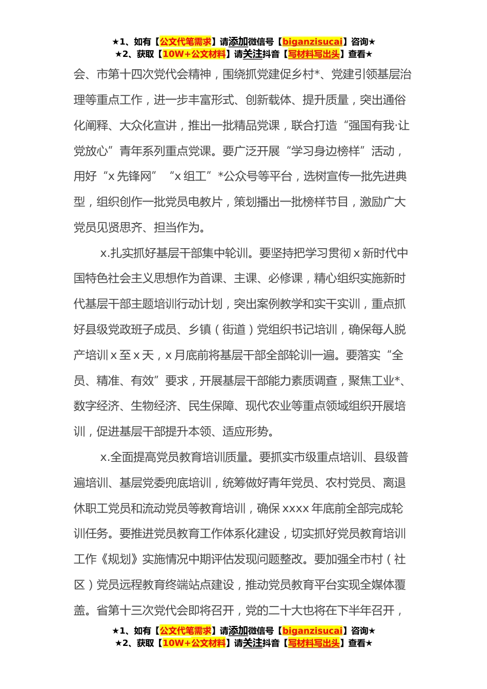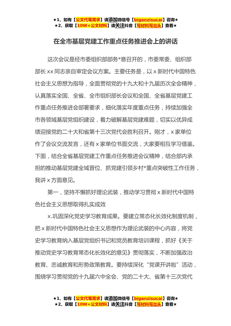 ★1、如有【公文代笔需求】请添加微信号【biganzisucai】咨询★★2、获取【10W+公文材料】请关注抖音【写材料写出头】查看★在全市基层党建工作重点任务推进会上的讲话这次会议是经市委组织部部务*意召开的,市委常委、组织部部长xx同志亲自审定会议方案。主要任务是,以x新时代中国特色社会主义思想为指导,全面贯彻党的十九大和十九届历次全会精神,认真落实全国、全省、全市组织部长会议和全国、全省基层党建工作重点任务推进会部署要求,细化落实年度重点任务,持续加强全市各领域基层党组织建设,着力破解基层党建难题,切实以优异成绩迎接党的二十大和省第十三次党代会胜利召开。刚才,x家单位作了会议交流发言,还有x家单位书面交流,大家要相互学习借鉴。下面,结合全省基层党建工作重点任务推进会议精神...