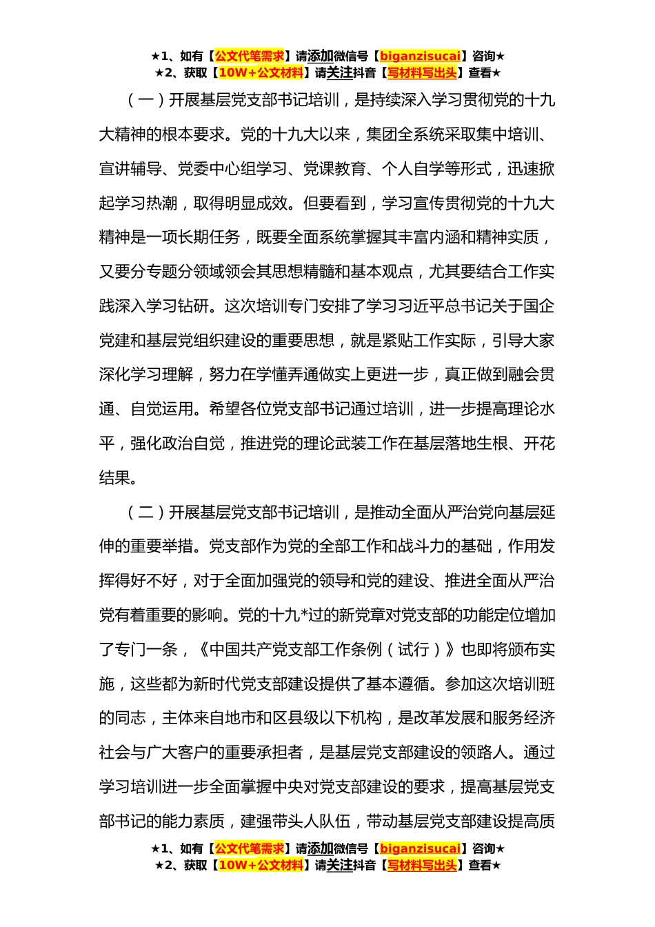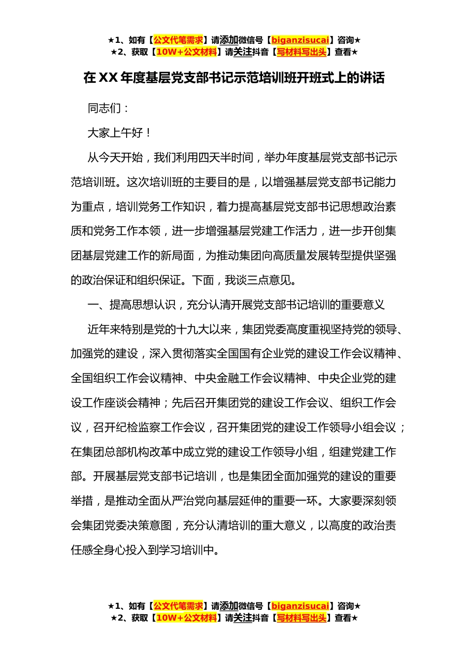 ★1、如有【公文代笔需求】请添加微信号【biganzisucai】咨询★★2、获取【10W+公文材料】请关注抖音【写材料写出头】查看★在XX年度基层党支部书记示范培训班开班式上的讲话同志们:大家上午好!从今天开始,我们利用四天半时间,举办年度基层党支部书记示范培训班。这次培训班的主要目的是,以增强基层党支部书记能力为重点,培训党务工作知识,着力提高基层党支部书记思想政治素质和党务工作本领,进一步增强基层党建工作活力,进一步开创集团基层党建工作的新局面,为推动集团向高质量发展转型提供坚强的政治保证和组织保证。下面,我谈三点意见。一、提高思想认识,充分认清开展党支部书记培训的重要意义近年来特别是党的十九大以来,集团党委高度重视坚持党的领导、加强党的建设,深入贯彻落实全国国有企业...