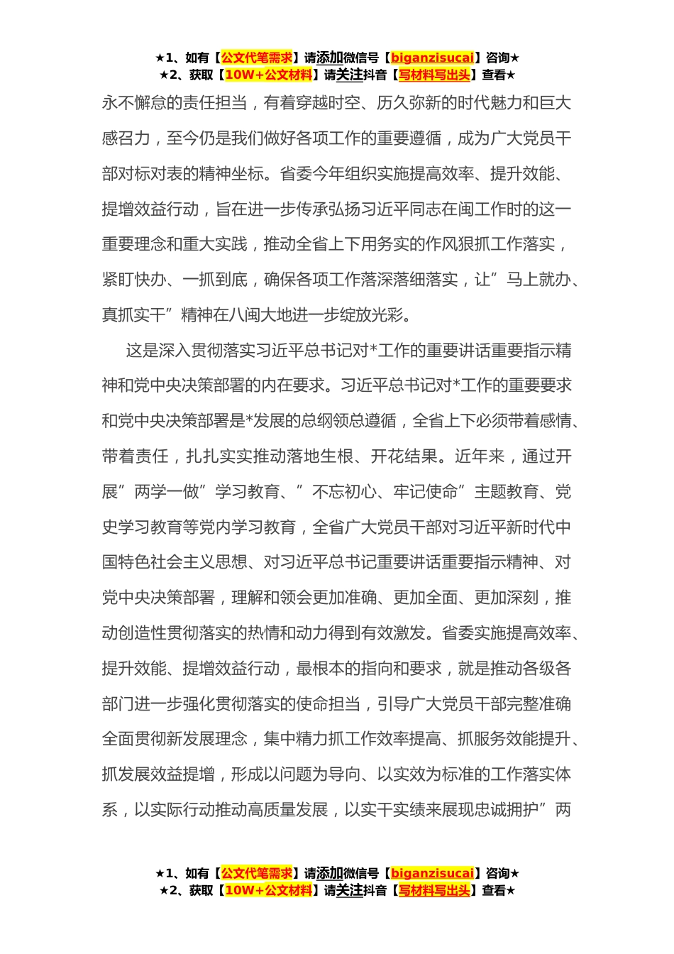 ★1、如有【公文代笔需求】请添加微信号【biganzisucai】咨询★★2、获取【10W+公文材料】请关注抖音【写材料写出头】查看★省委政研室讲稿:提高效率提升效能提增效益新年伊始,省委部署实施提高效率、提升效能、提增效益行动。这是深入贯彻落实习近平总书记重要讲话重要指示精神的实际举措,是进一步贯彻新发展理念、推动高质量发展的重要抓手,是加快新发展阶段新*建设的题中应有之义,是新形势下推动干部提升能力素质、改进工作作风的一个有效载体。全省上下闻令而动,进一步吹响”马上就办、真抓实干”的进军号,以战斗的姿态抓紧每一天、干好每一月,奋力推动各项工作提速增效。一季度经济社会发展取得预期成效,经济运行总体保持在合理区间,社会大局保持*稳定。(一)实施提高效率、提升效能、提增效益行...
