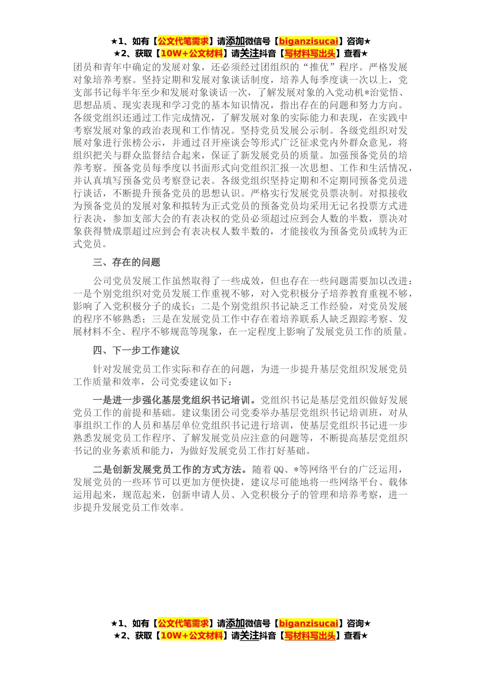 ★1、如有【公文代笔需求】请添加微信号【biganzisucai】咨询★★2、获取【10W+公文材料】请关注抖音【写材料写出头】查看★党委组织部:公司党委按照集团公司党委的要求,遵循“坚持标准,保证质量,改善结构,慎重发展”的十六字方针,根据年初党员发展计划,加强领导,狠抓培养,严格程序,认真做好发展党员工作,圆满完成了本年度的党员发展任务。现将具体工作报告如下:一、基本情况**,按照年初集团公司党委组织部下发的《关于下发**度发展党员指导性计划的通知》精神,结合公司实际,共发展党员*名,其中,发展女性党员*,*岁以下的优秀青年*名,占*%;大专及以上文化程度的*名,占*%。二、主要做法公司党委高度重视发展党员工作,把发展党员计划的执行作为加强基层组织建设的重要措施,抓细抓实,促进了党...