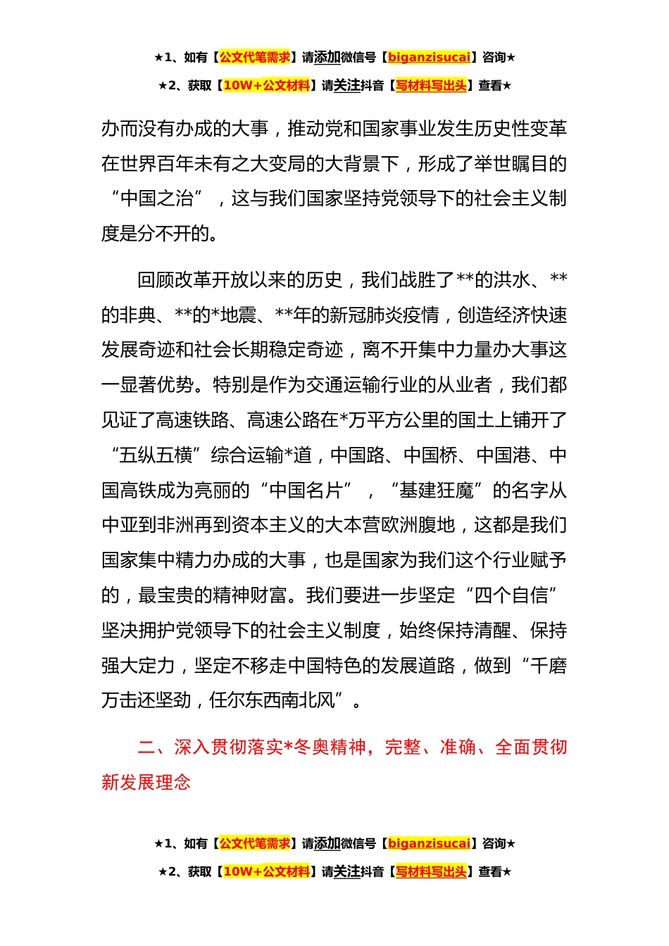 ★1、如有【公文代笔需求】请添加微信号【biganzisucai】咨询★★2、获取【10W+公文材料】请关注抖音【写材料写出头】查看★学习习近平总书记在*冬奥会、冬残奥会总结表彰大会上的讲话心得体会按照公司理论学习中心组学习计划,我利用业余时间学习了习近平总书记在*冬奥会、冬残奥会总结表彰大会上的讲话。借此机会,与大家分享总书记讲话里,最打动我的两个片段。一、*冬奥会、冬残奥会的胜利召开,彰显了我国“集中精力办大事”的体制优势习近平总书记在总结筹办举办*冬奥会、冬残奥会的经验时着重强调,我国社会主义制度非凡的组织动员能力、统筹协调能力、贯彻执行能力,我国坚实的经济实力、科技实力、综合国力,为*办奥提供了强有力的底气和最坚实的保障。作为党领导下的社会主义国家,我国的国家制度和国家...