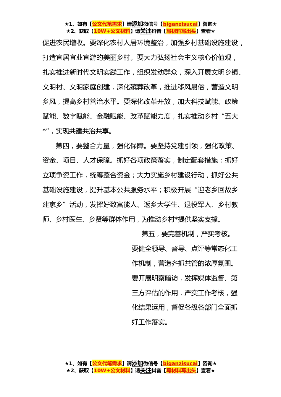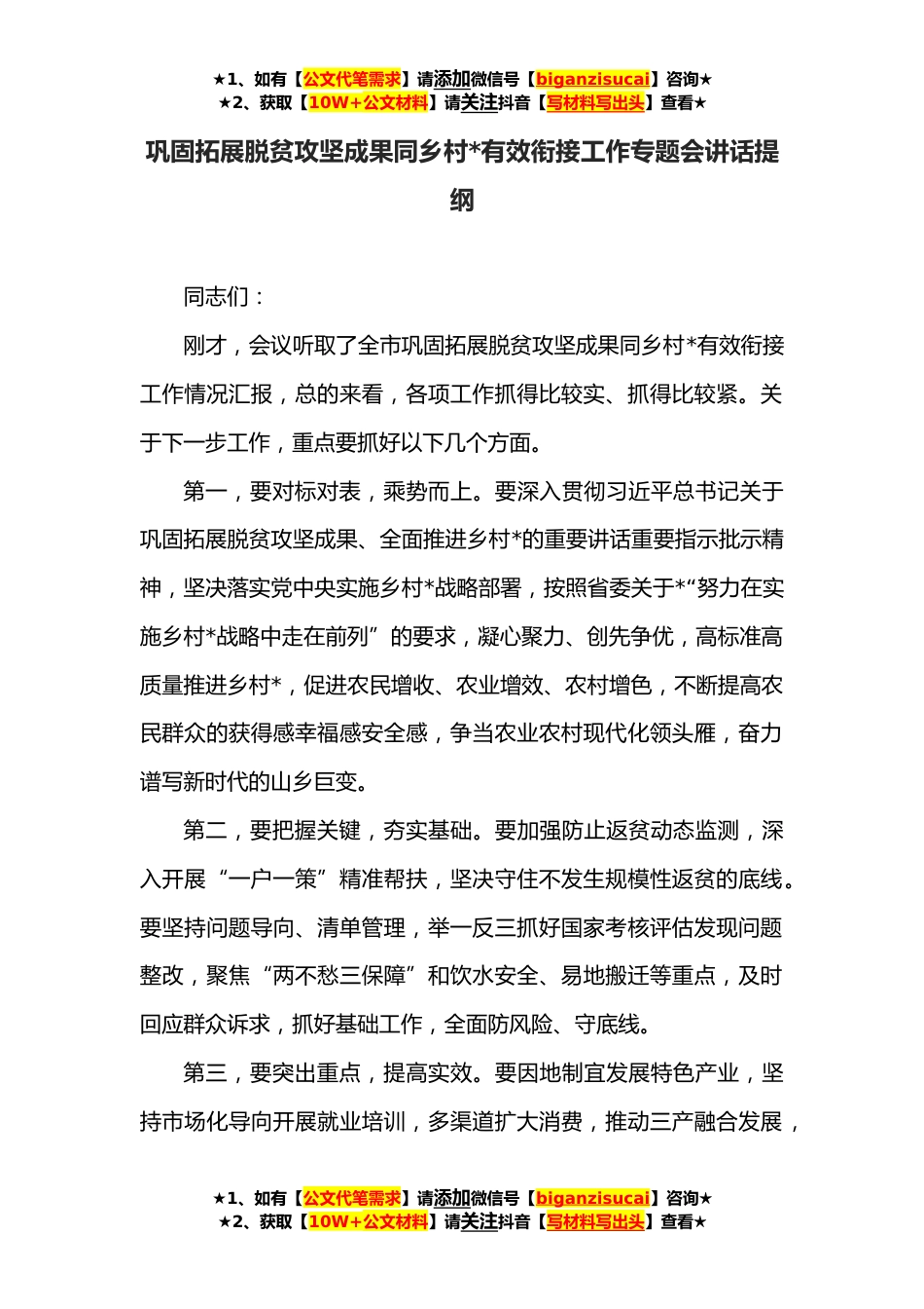 ★1、如有【公文代笔需求】请添加微信号【biganzisucai】咨询★★2、获取【10W+公文材料】请关注抖音【写材料写出头】查看★巩固拓展脱贫攻坚成果同乡村*有效衔接工作专题会讲话提纲同志们:刚才,会议听取了全市巩固拓展脱贫攻坚成果同乡村*有效衔接工作情况汇报,总的来看,各项工作抓得比较实、抓得比较紧。关于下一步工作,重点要抓好以下几个方面。第一,要对标对表,乘势而上。要深入贯彻习近平总书记关于巩固拓展脱贫攻坚成果、全面推进乡村*的重要讲话重要指示批示精神,坚决落实党中央实施乡村*战略部署,按照省委关于*“努力在实施乡村*战略中走在前列”的要求,凝心聚力、创先争优,高标准高质量推进乡村*,促进农民增收、农业增效、农村增色,不断提高农民群众的获得感幸福感安全感,争当农业农村现代...