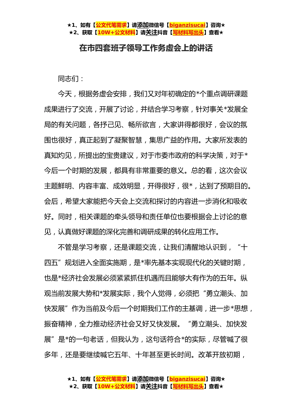 ★1、如有【公文代笔需求】请添加微信号【biganzisucai】咨询★★2、获取【10W+公文材料】请关注抖音【写材料写出头】查看★在市四套班子领导工作务虚会上的讲话同志们:今天,根据务虚会安排,我们又对年初确定的*个重点调研课题成果进行了交流,开展了讨论,并结合学习考察,针对事关*发展全局的有关问题,各抒己见、畅所欲言,大家讲得都很好,会议的氛围也很好,真正起到了凝聚智慧,集思广益的作用。大家所发表的真知灼见,所提出的宝贵建议,对于市委市政府的科学决策,对于*今后一个时期的发展,都具有非常重要的意义。总的看,这次会议主题鲜明、内容丰富、成效明显,开得很好,很*,达到了预期目的。会后,希望大家能把今天会上交流和探讨的内容进一步消化和吸收好。同时,相关课题的牵头领导和责任单位...