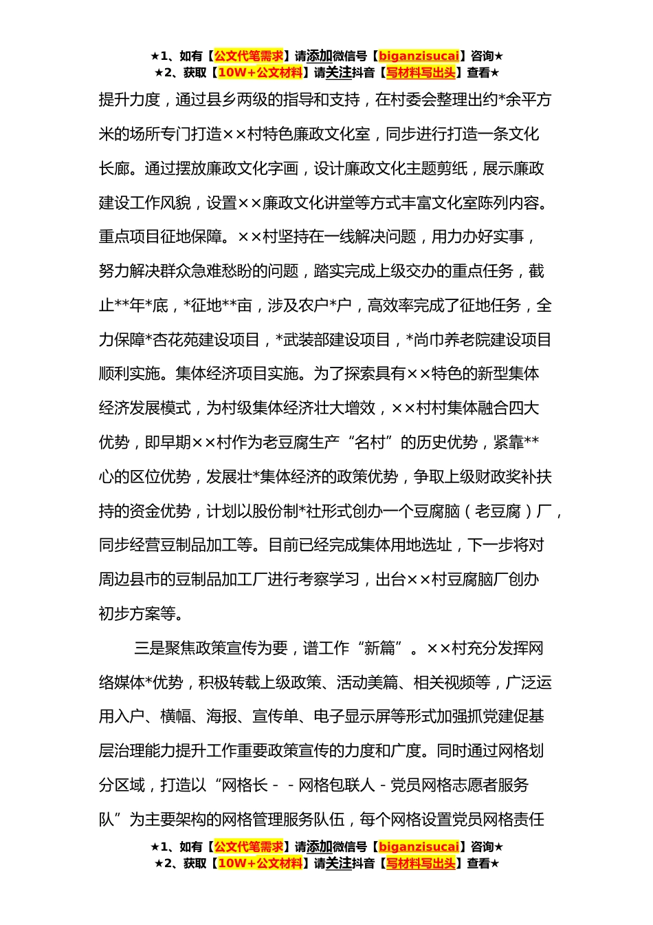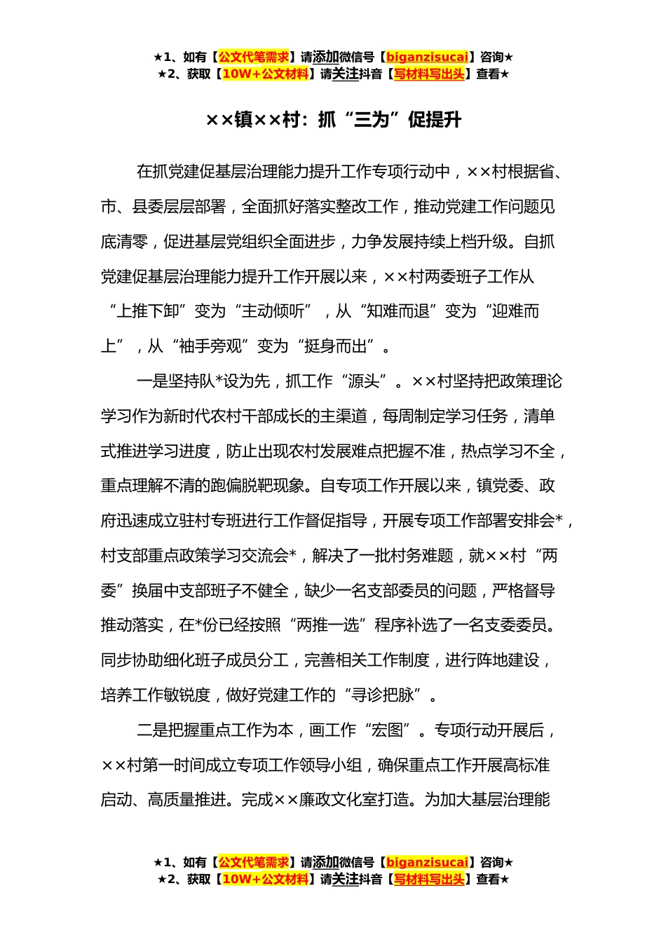 ★1、如有【公文代笔需求】请添加微信号【biganzisucai】咨询★★2、获取【10W+公文材料】请关注抖音【写材料写出头】查看★××镇××村:抓“三为”促提升在抓党建促基层治理能力提升工作专项行动中,××村根据省、市、县委层层部署,全面抓好落实整改工作,推动党建工作问题见底清零,促进基层党组织全面进步,力争发展持续上档升级。自抓党建促基层治理能力提升工作开展以来,××村两委班子工作从“上推下卸”变为“主动倾听”,从“知难而退”变为“迎难而上”,从“袖手旁观”变为“挺身而出”。一是坚持队*设为先,抓工作“源头”。××村坚持把政策理论学习作为新时代农村干部成长的主渠道,每周制定学习任务,清单式推进学习进度,防止出现农村发展难点把握不准,热点学习不全,重点理解不清的跑偏脱靶...
