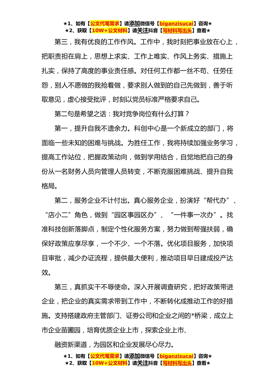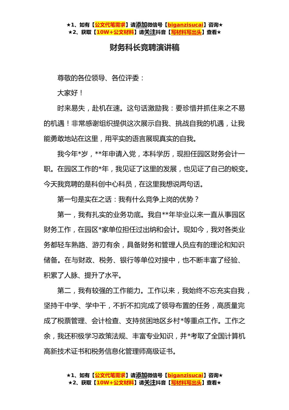 ★1、如有【公文代笔需求】请添加微信号【biganzisucai】咨询★★2、获取【10W+公文材料】请关注抖音【写材料写出头】查看★财务科长竞聘演讲稿尊敬的各位领导、各位评委:大家好!时来易失,赴机在速。这句话激励我:要珍惜并抓住来之不易的机遇!非常感谢组织提供这次展示自我、挑战自我的机遇,让我能勇敢地站在这里,用平实的语言展现真实的自我。我今年*岁,**年申请入党,本科学历,现担任园区财务会计一职。在园区工作的*年,我见证了这里的发展,也见证了自己的蜕变。今天我竞聘的是科创中心科员,在这里我想说两句话。第一句是实在之话:我有什么竞争上岗的优势?第一,我有扎实的业务功底。我自**年毕业以来一直从事园区财务工作,在园区*家单位担任过出纳和会计。现如今,我对各类业务都轻车熟路、游刃...