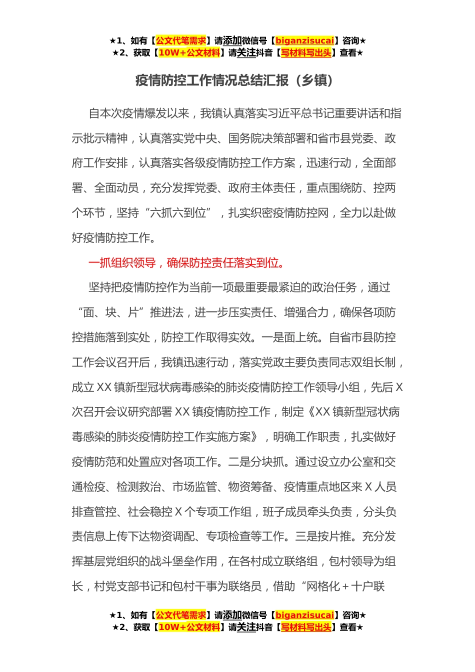 ★1、如有【公文代笔需求】请添加微信号【biganzisucai】咨询★★2、获取【10W+公文材料】请关注抖音【写材料写出头】查看★疫情防控工作情况总结汇报(乡镇)自本次疫情爆发以来,我镇认真落实习近平总书记重要讲话和指示批示精神,认真落实党中央、国务院决策部署和省市县党委、政府工作安排,认真落实各级疫情防控工作方案,迅速行动,全面部署、全面动员,充分发挥党委、政府主体责任,重点围绕防、控两个环节,坚持“六抓六到位”,扎实织密疫情防控网,全力以赴做好疫情防控工作。一抓组织领导,确保防控责任落实到位。坚持把疫情防控作为当前一项最重要最紧迫的政治任务,通过“面、块、片”推进法,进一步压实责任、增强合力,确保各项防控措施落到实处,防控工作取得实效。一是面上统。自省市县防控工作...