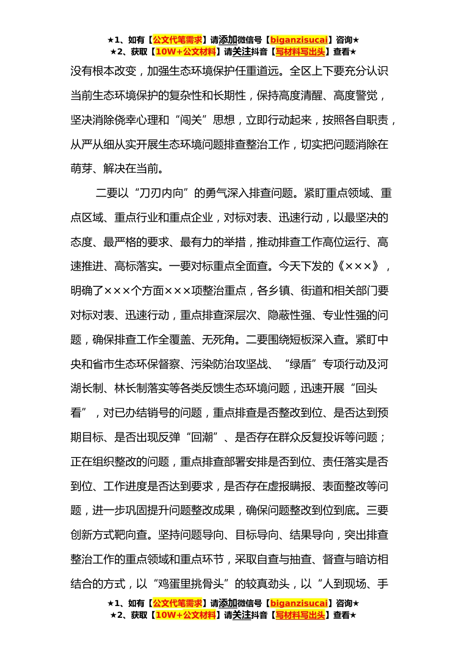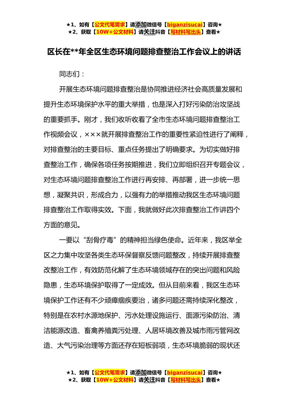 ★1、如有【公文代笔需求】请添加微信号【biganzisucai】咨询★★2、获取【10W+公文材料】请关注抖音【写材料写出头】查看★区长在**年全区生态环境问题排查整治工作会议上的讲话同志们:开展生态环境问题排查整治是协同推进经济社会高质量发展和提升生态环境保护水平的重大举措,也是深入打好污染防治攻坚战的重要抓手。刚才,我们收听收看了全市生态环境问题排查整治工作视频会议,×××就开展排查整治工作的重要性紧迫性进行了阐释,对排查整治的主要目标、重点任务提出了明确要求。为切实做好排查整治工作,确保各项任务按期推进,我们立即组织召开专题会议,对生态环境问题排查整治工作进行再安排、再部署,进一步统一思想,凝聚共识,形成合力,以强有力的举措推动我区生态环境问题排查整治工作取得实效。...