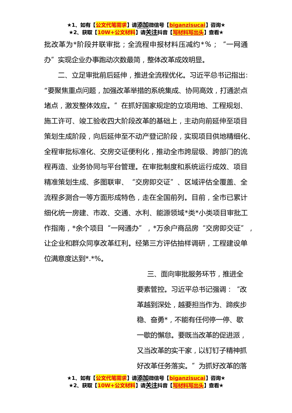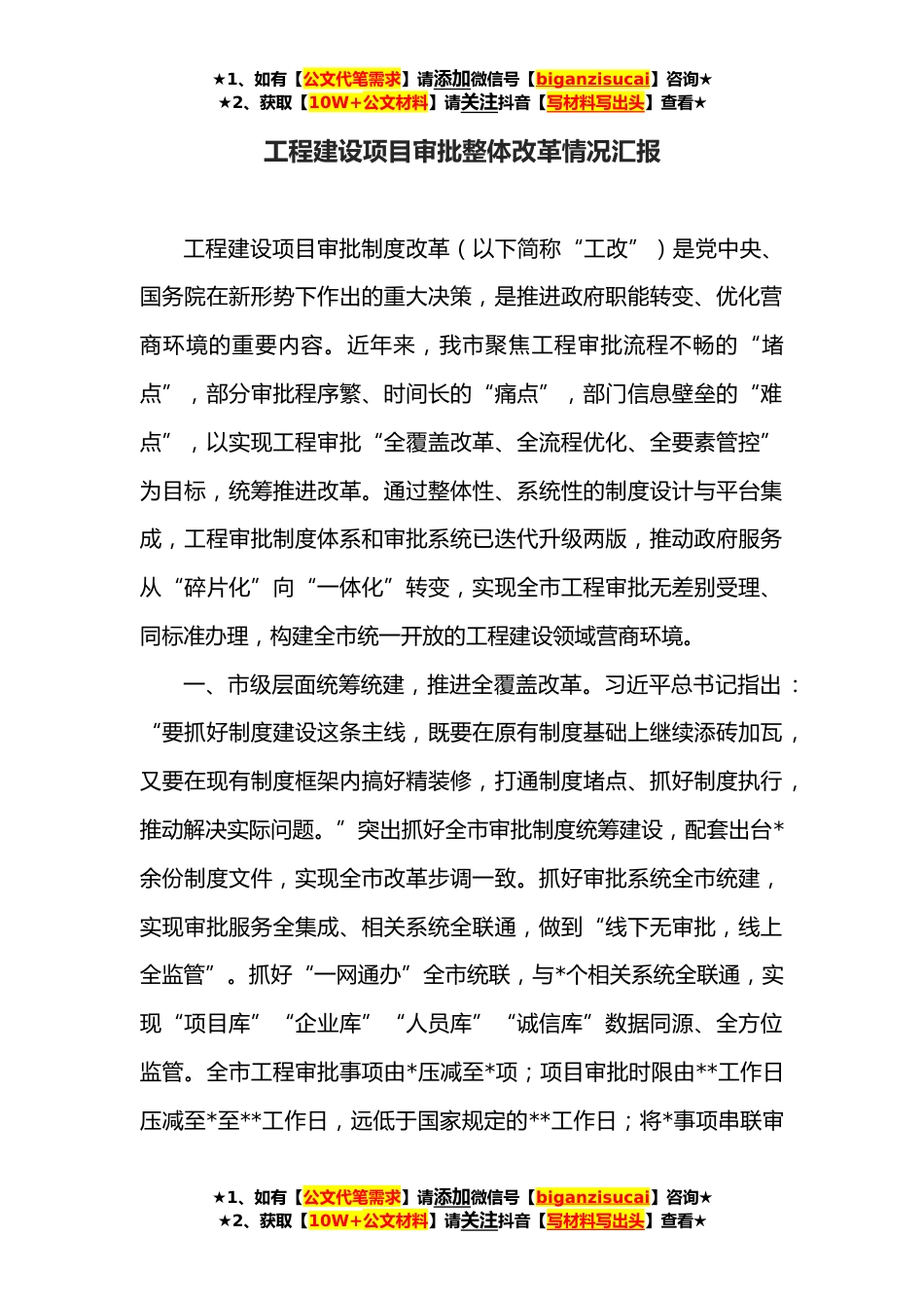 ★1、如有【公文代笔需求】请添加微信号【biganzisucai】咨询★★2、获取【10W+公文材料】请关注抖音【写材料写出头】查看★工程建设项目审批整体改革情况汇报工程建设项目审批制度改革(以下简称“工改”)是党中央、国务院在新形势下作出的重大决策,是推进政府职能转变、优化营商环境的重要内容。近年来,我市聚焦工程审批流程不畅的“堵点”,部分审批程序繁、时间长的“痛点”,部门信息壁垒的“难点”,以实现工程审批“全覆盖改革、全流程优化、全要素管控”为目标,统筹推进改革。通过整体性、系统性的制度设计与平台集成,工程审批制度体系和审批系统已迭代升级两版,推动政府服务从“碎片化”向“一体化”转变,实现全市工程审批无差别受理、同标准办理,构建全市统一开放的工程建设领域营商环境。一、...
