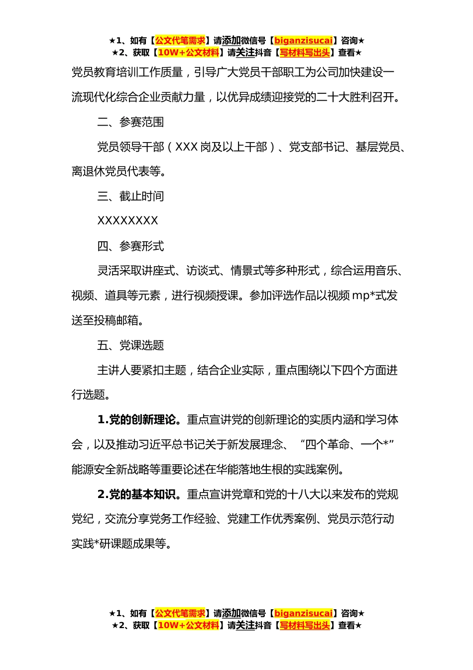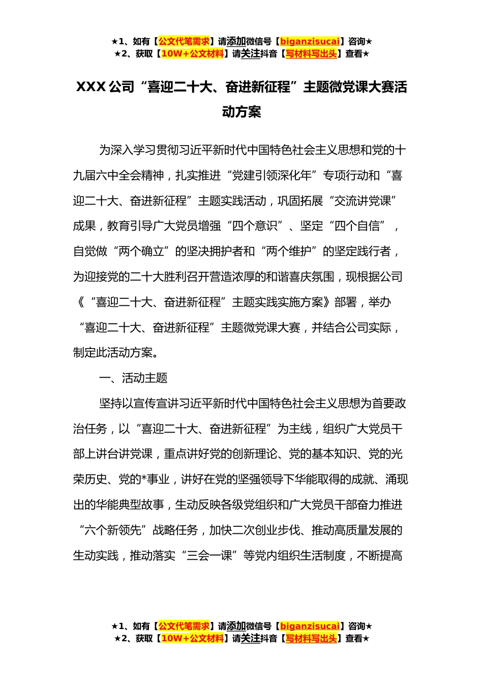 ★1、如有【公文代笔需求】请添加微信号【biganzisucai】咨询★★2、获取【10W+公文材料】请关注抖音【写材料写出头】查看★XXX公司“喜迎二十大、奋进新征程”主题微党课大赛活动方案为深入学习贯彻习近平新时代中国特色社会主义思想和党的十九届六中全会精神,扎实推进“党建引领深化年”专项行动和“喜迎二十大、奋进新征程”主题实践活动,巩固拓展“交流讲党课”成果,教育引导广大党员增强“四个意识”、坚定“四个自信”,自觉做“两个确立”的坚决拥护者和“两个维护”的坚定践行者,为迎接党的二十大胜利召开营造浓厚的和谐喜庆氛围,现根据公司《“喜迎二十大、奋进新征程”主题实践实施方案》部署,举办“喜迎二十大、奋进新征程”主题微党课大赛,并结合公司实际,制定此活动方案。一、活动主题坚持以...