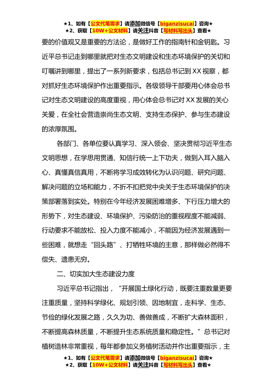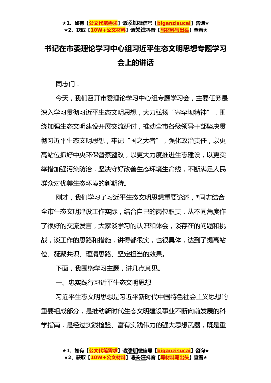 ★1、如有【公文代笔需求】请添加微信号【biganzisucai】咨询★★2、获取【10W+公文材料】请关注抖音【写材料写出头】查看★书记在市委理论学习中心组习近平生态文明思想专题学习会上的讲话同志们:今天,我们召开市委理论学习中心组专题学习会,主要任务是深入学习贯彻习近平生态文明思想,大力弘扬“塞罕坝精神”,围绕加强生态文明建设开展交流研讨,推动全市各级领导干部坚决贯彻习近平生态文明思想,牢记“国之大者”,强化政治责任,以更高站位抓好中央环保督察整改,以更大力度推进生态建设,以更实举措加强污染防治,坚决守好改善生态环境生命线,不断满足人民群众对优美生态环境的新期待。刚才,我们学习了习近平生态文明思想重要论述,*同志结合全市生态文明建设工作实际,结合自己的岗位职责,从不同角...
