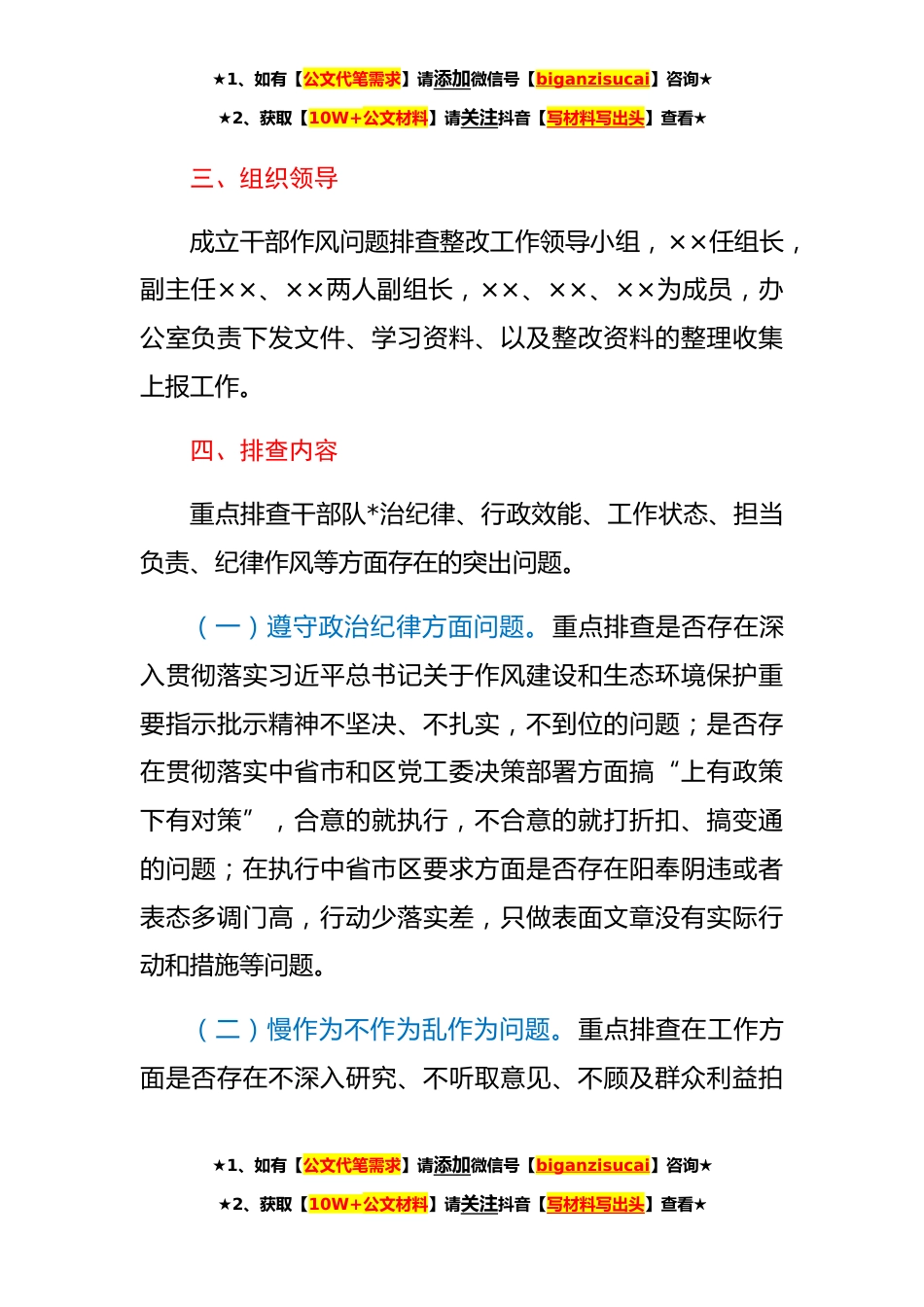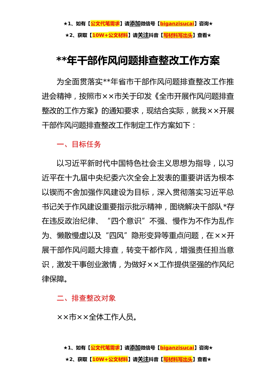★1、如有【公文代笔需求】请添加微信号【biganzisucai】咨询★★2、获取【10W+公文材料】请关注抖音【写材料写出头】查看★**年干部作风问题排查整改工作方案为全面贯落实**年省市干部作风问题排查整改工作推进会精神,按照市××市关于印发《全市开展作风问题排查整改的工作方案》的通知要求,现结合实际,就我××开展干部作风问题排查整改工作制定工作方案如下:一、目标任务以习近平新时代中国特色社会主义思想为指导,以习近平在十九届中央纪委六次全会上发表的重要讲话为根本以锲而不舍加强作风建设为目标,深入贯彻落实习近平总书记关于作风建设重要指示批示精神,图绕解决干部队*存在违反政治纪律、“四个意识”不强、慢作为不作为乱作为、懒散慢虚以及“四风”隐形变异等重点问题,在××开展干部作风问...