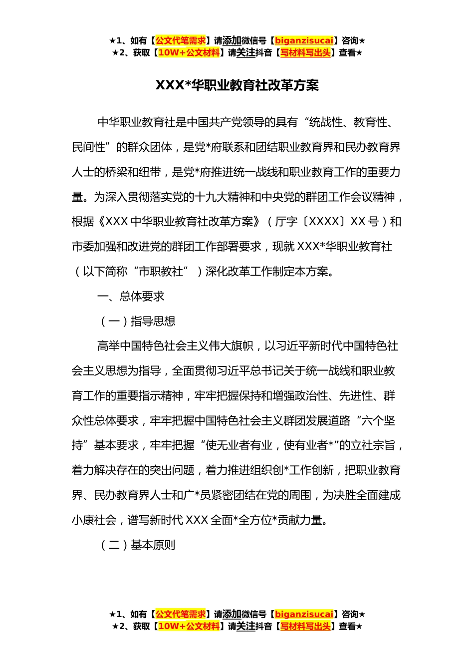 ★1、如有【公文代笔需求】请添加微信号【biganzisucai】咨询★★2、获取【10W+公文材料】请关注抖音【写材料写出头】查看★XXX*华职业教育社改革方案中华职业教育社是中国共产党领导的具有“统战性、教育性、民间性”的群众团体,是党*府联系和团结职业教育界和民办教育界人士的桥梁和纽带,是党*府推进统一战线和职业教育工作的重要力量。为深入贯彻落实党的十九大精神和中央党的群团工作会议精神,根据《XXX中华职业教育社改革方案》(厅字〔XXXX〕XX号)和市委加强和改进党的群团工作部署要求,现就XXX*华职业教育社(以下简称“市职教社”)深化改革工作制定本方案。一、总体要求(一)指导思想高举中国特色社会主义伟大旗帜,以习近平新时代中国特色社会主义思想为指导,全面贯彻习近平总书记关于统一战线和...