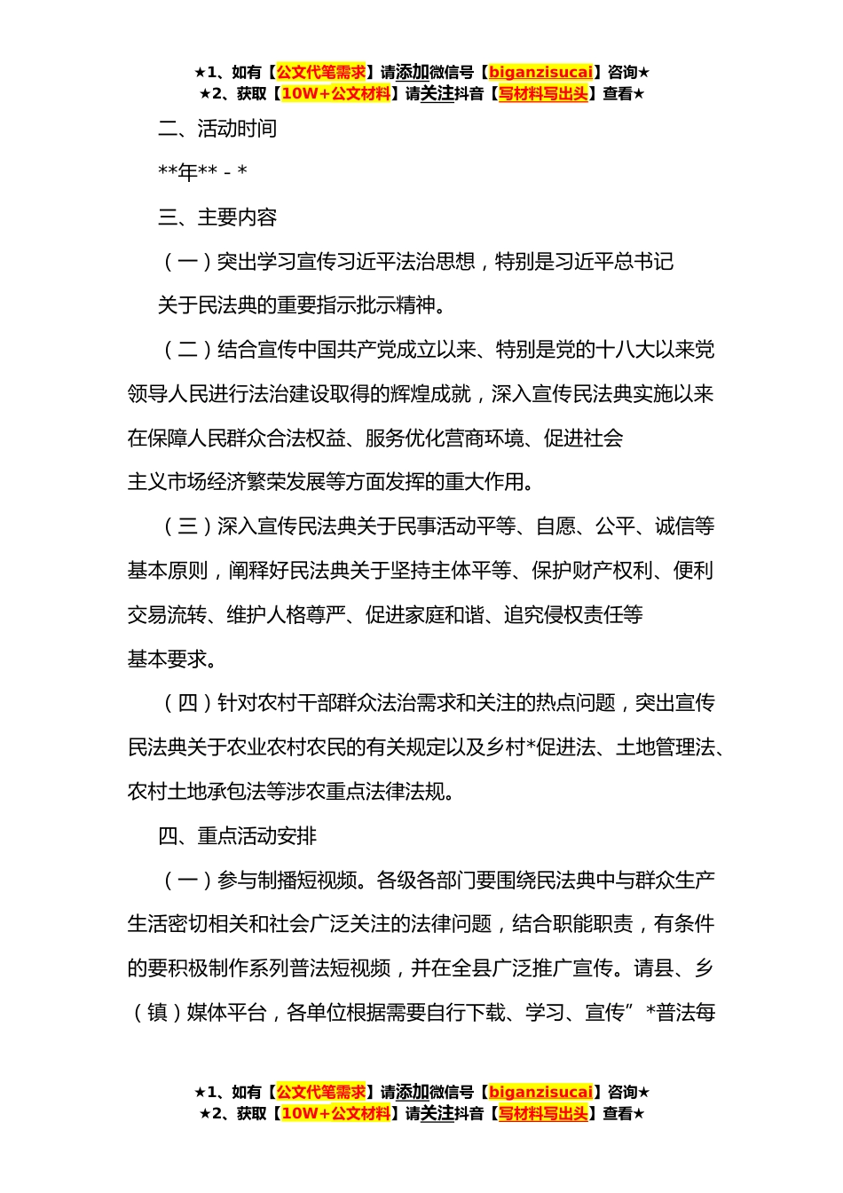 ★1、如有【公文代笔需求】请添加微信号【biganzisucai】咨询★★2、获取【10W+公文材料】请关注抖音【写材料写出头】查看★**年某县”美好生活·民法典相伴”主题宣传方案为深入学习贯彻习近平法治思想,特别是习近平总书记关于加强民法典学习宣传的重要指示精神,让民法典走到群众身边、走进群众心里,根据《州委宣传部州委普法办州司法局州农业农村局关于印发《**年”美好生活·民法典相伴”主题宣传方案》的通知》要求,县委宣传部、县委普法办、县司法局、县农业农村局决定于今年*以”美好生活·民法典相伴”为主题,以”民法典进农村”为重点,在全县组织开展第二个”民法典宣传月”活动,现结合我县实际,特制定如下方案。一、指导思想坚持以习近平新时代中国特色社会主义思想为指导,全面贯彻党的十九大和...