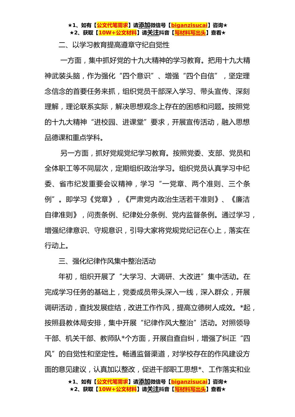 ★1、如有【公文代笔需求】请添加微信号【biganzisucai】咨询★★2、获取【10W+公文材料】请关注抖音【写材料写出头】查看★学校党风廉政建设和作风建设工作总结**年,**校在县委、县教体局党委的领导下,按照中央和省市县党风廉政建设总体部署,全面落实县属学校党风廉政建设暨作风建设责任书任务,紧紧围绕学校中心工作,坚持从严抓作风,形成风清气正的校园氛围,有力促进了学校各项业务工作的顺利开展。一、认真落实党风廉政建设主体责任加强学习教育,提高思想认识,把落实党风廉政建设党委主体责任,作为事关擦亮党组织形象、提高党委和各支部领导力、推动各项工作顺利开展的重要保障。成立了以校党委书记任组长、纪委书记任副组长、其他党委成员参与的党风廉政建设领导小组。学校党委书记充分发挥“党风廉...