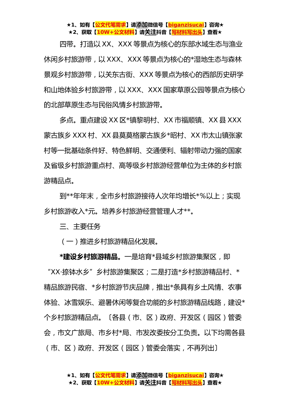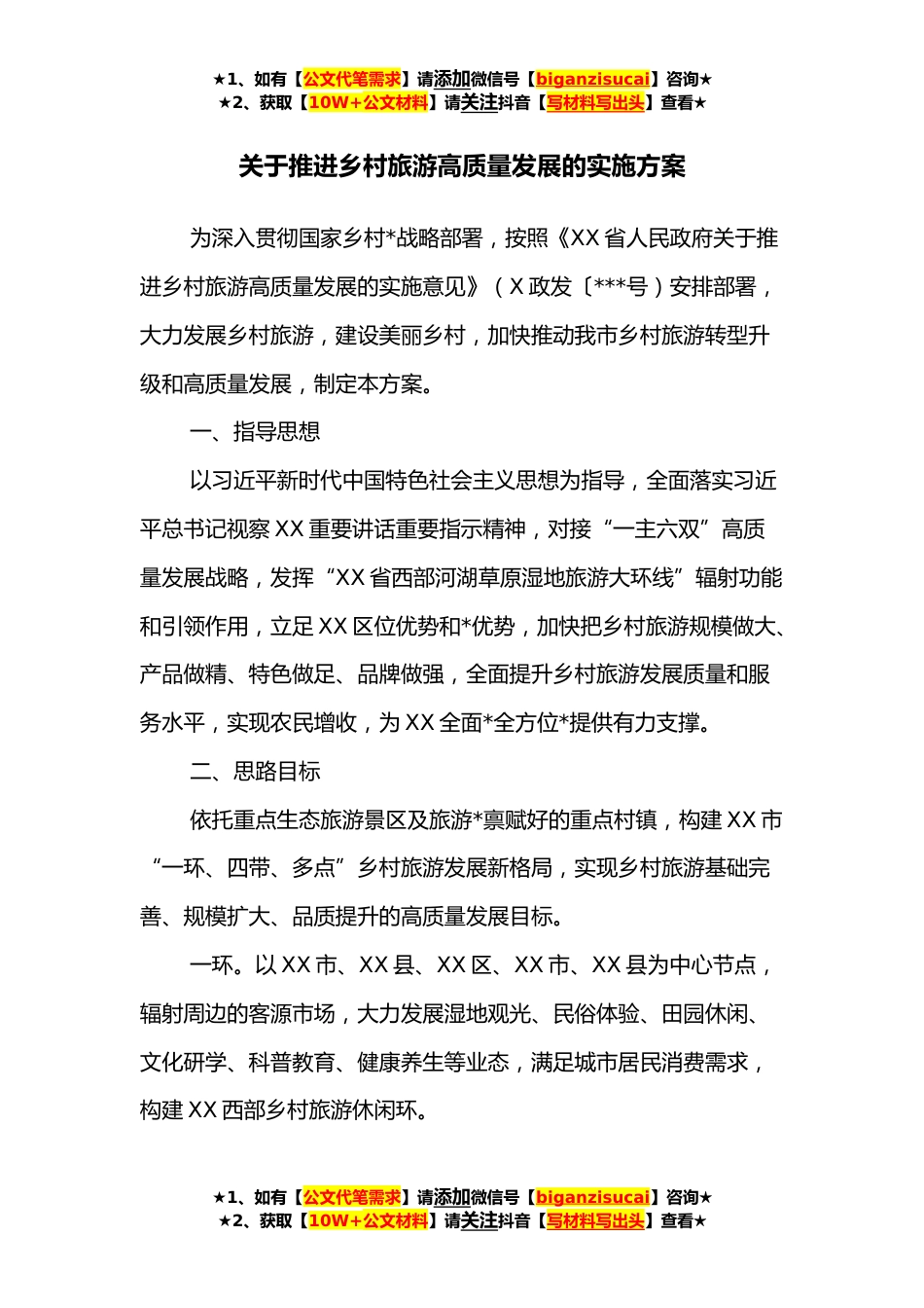 ★1、如有【公文代笔需求】请添加微信号【biganzisucai】咨询★★2、获取【10W+公文材料】请关注抖音【写材料写出头】查看★关于推进乡村旅游高质量发展的实施方案为深入贯彻国家乡村*战略部署,按照《XX省人民政府关于推进乡村旅游高质量发展的实施意见》(X政发〔***号)安排部署,大力发展乡村旅游,建设美丽乡村,加快推动我市乡村旅游转型升级和高质量发展,制定本方案。一、指导思想以习近平新时代中国特色社会主义思想为指导,全面落实习近平总书记视察XX重要讲话重要指示精神,对接“一主六双”高质量发展战略,发挥“XX省西部河湖草原湿地旅游大环线”辐射功能和引领作用,立足XX区位优势和*优势,加快把乡村旅游规模做大、产品做精、特色做足、品牌做强,全面提升乡村旅游发展质量和服务水平,实现农民...