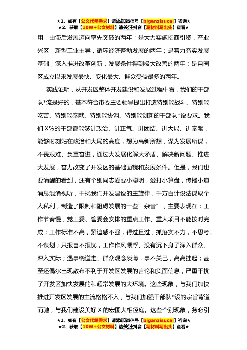 ★1、如有【公文代笔需求】请添加微信号【biganzisucai】咨询★★2、获取【10W+公文材料】请关注抖音【写材料写出头】查看★在”作风转变年”活动动员会上的讲话同志们:按照市委、市政府关于”作风转变年”的要求和部署,经开发区党工委、管委会研究决定,我们今天召开开发区”作风转变年”活动动员会,主要目的就是要进一步统一思想、转变作风、提升境界、激发活力,努力形成风清气正的干事创业氛围,为开发区发挥引领作用、率先跨越发展、全面建设美好X提供有力保证。下面,我讲四点意见。一、对开发区干部队*总体评价开发区正式成立两年来,全体干部职工在党工委、管委会的正确领导下,按照市委、市政府”举全市之力,建设开发区”的战略部署,认真落实市委主要领导提出”发挥引领作用,率先跨越发展”,致力...