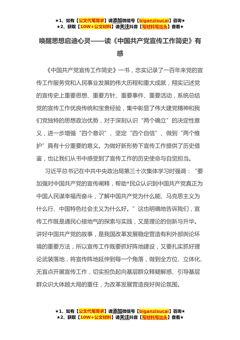 ★1、如有【公文代笔需求】请添加微信号【biganzisucai】咨询★★2、获取【10W+公文材料】请关注抖音【写材料写出头】查看★唤醒思想启迪心灵——读《中国共产党宣传工作简史》有感《中国共产党宣传工作简史》一书,忠实记录了一百年来党的宣传工作服务党和人民事业发展的伟大历程和重大成就,翔实记述党的宣传史上重要思想、重要方针、重要事件、重要活动,系统总结党的宣传工作优良传统和宝贵经验,集中彰显了伟大建党精神和我们党独特的思想政治优势,对于深刻认识“两个确立”的决定性意义,进一步增强“四个意识”、坚定“四个自信”、做到“两个维护”具有十分重要的意义。为做好新形势下宣传工作提供了历史借鉴,也让我们从书中感受到了宣传工作的历史使命与自觉担当。习近平总书记在中共中央政治局第三十...