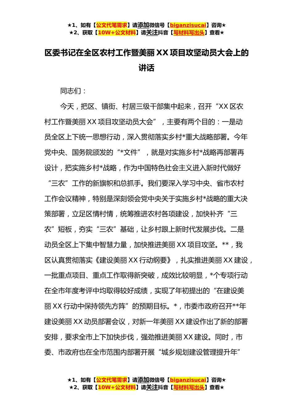 ★1、如有【公文代笔需求】请添加微信号【biganzisucai】咨询★★2、获取【10W+公文材料】请关注抖音【写材料写出头】查看★区委书记在全区农村工作暨美丽XX项目攻坚动员大会上的讲话同志们:今天,把区、镇街、村居三级干部集中起来,召开“XX区农村工作暨美丽XX项目攻坚动员大会”,主要有两个目的:一是动员全区上下统一思想行动,深入贯彻落实乡村*重大战略部署。今年党中央、国务院颁发的“*文件”,就是对实施乡村*战略再部署再设计,把实施乡村*战略,作为中国特色社会主义进入新时代做好“三农”工作的新旗帜和总抓手。我们要深入学习中央、省市农村工作会议精神,特别是深刻领会党中央关于实施乡村*战略的重大决策部署,立足区情村情,统筹推进农村各项建设,加快补齐“三农”短板,夯实“三农”基础,让...
