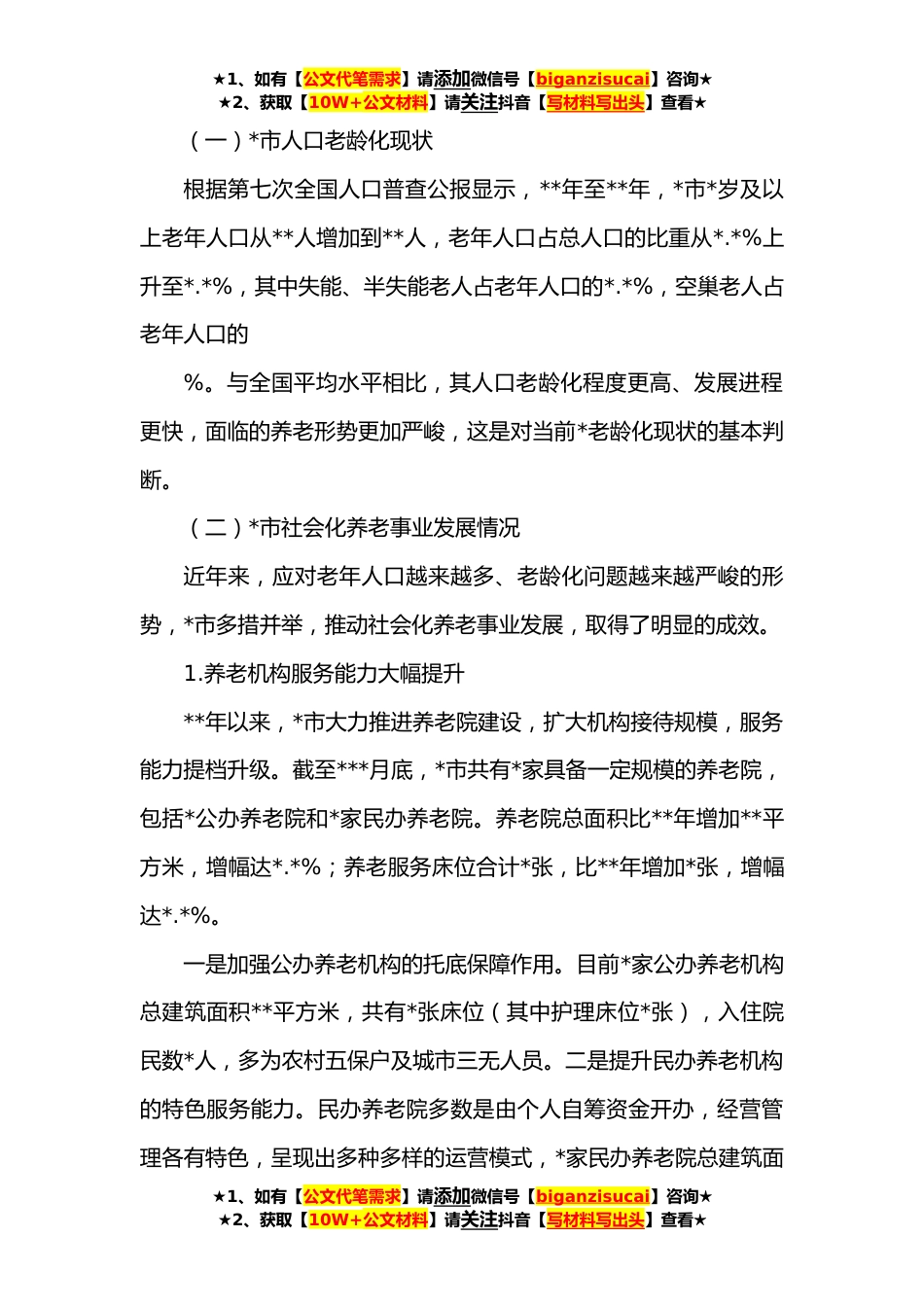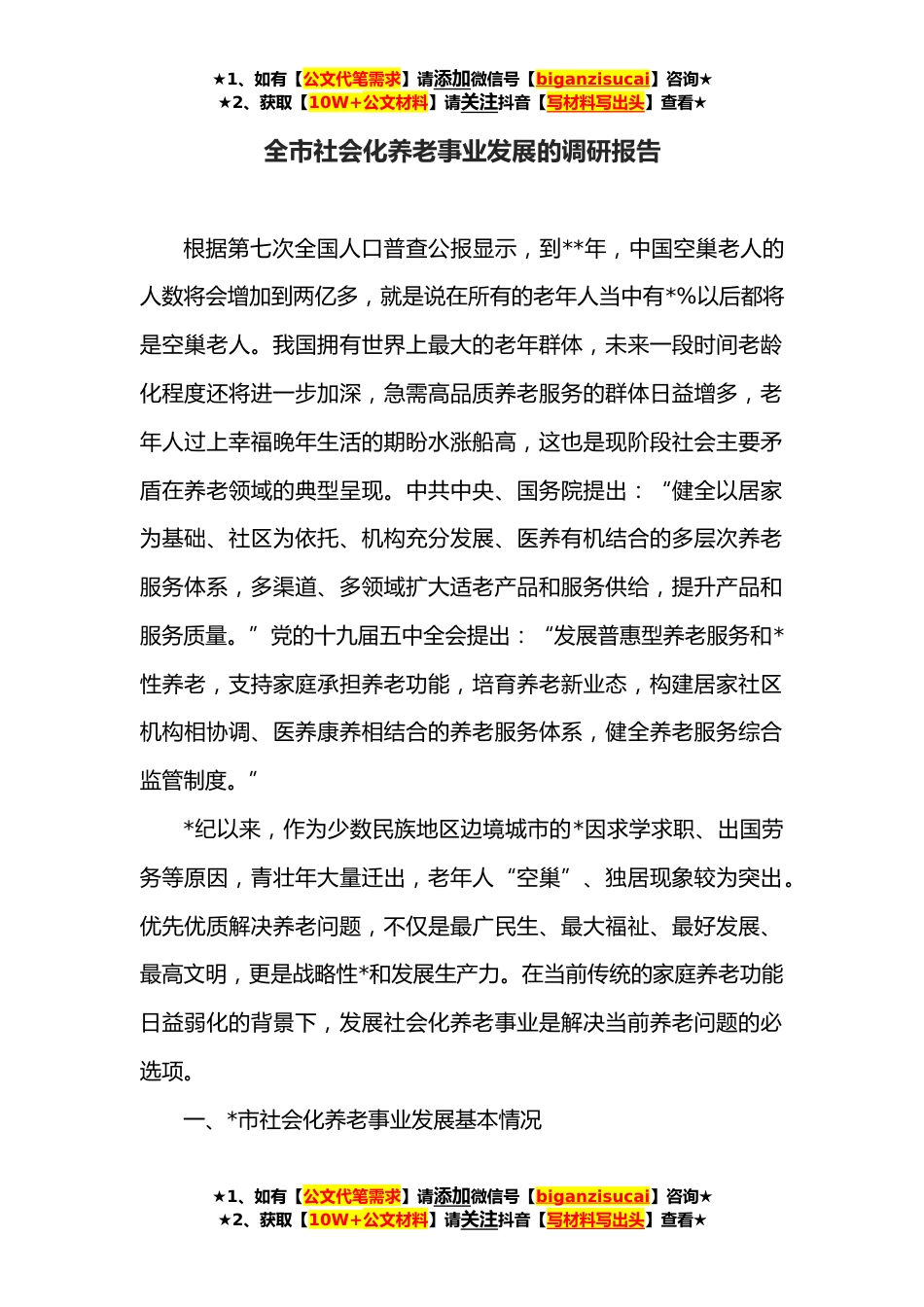 ★1、如有【公文代笔需求】请添加微信号【biganzisucai】咨询★★2、获取【10W+公文材料】请关注抖音【写材料写出头】查看★全市社会化养老事业发展的调研报告根据第七次全国人口普查公报显示,到**年,中国空巢老人的人数将会增加到两亿多,就是说在所有的老年人当中有*%以后都将是空巢老人。我国拥有世界上最大的老年群体,未来一段时间老龄化程度还将进一步加深,急需高品质养老服务的群体日益增多,老年人过上幸福晚年生活的期盼水涨船高,这也是现阶段社会主要矛盾在养老领域的典型呈现。中共中央、国务院提出:“健全以居家为基础、社区为依托、机构充分发展、医养有机结合的多层次养老服务体系,多渠道、多领域扩大适老产品和服务供给,提升产品和服务质量。”党的十九届五中全会提出:“发展普惠型养老服...