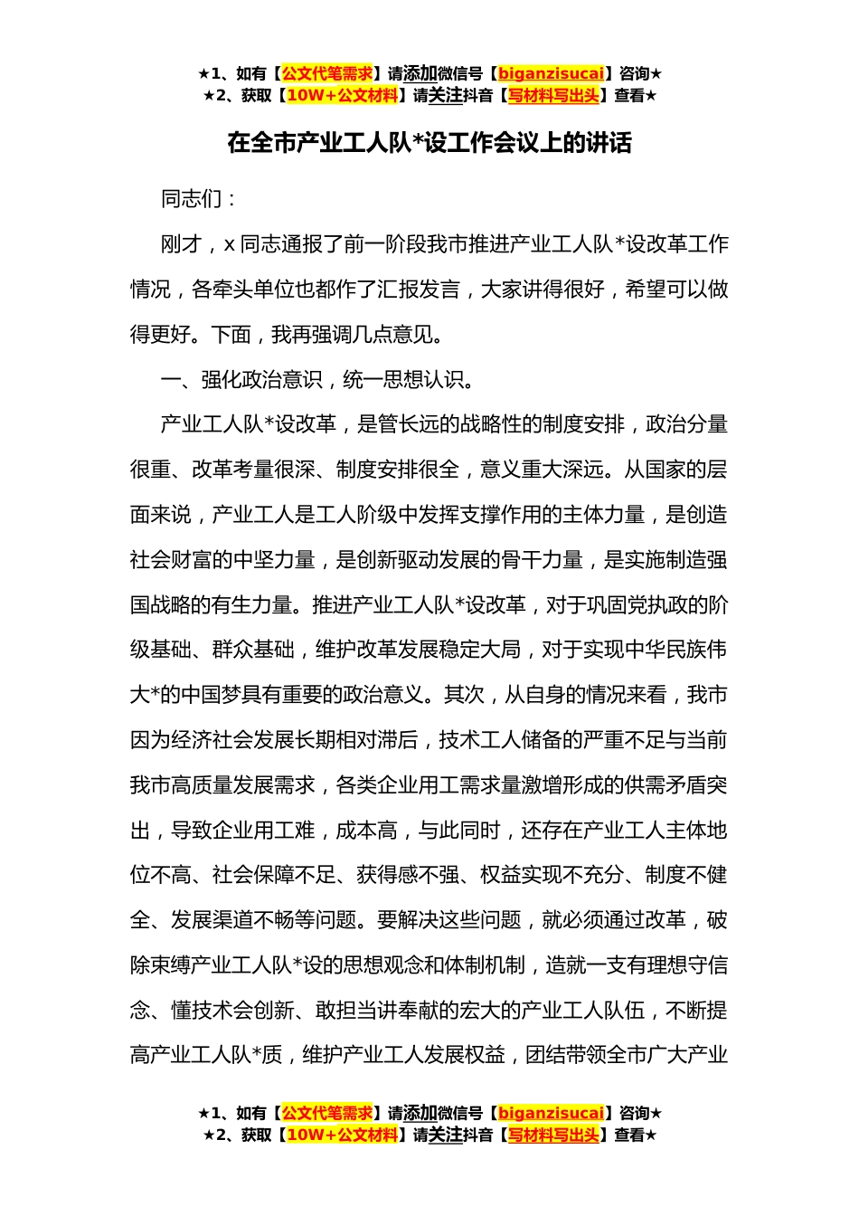 ★1、如有【公文代笔需求】请添加微信号【biganzisucai】咨询★★2、获取【10W+公文材料】请关注抖音【写材料写出头】查看★在全市产业工人队*设工作会议上的讲话同志们:刚才,x同志通报了前一阶段我市推进产业工人队*设改革工作情况,各牵头单位也都作了汇报发言,大家讲得很好,希望可以做得更好。下面,我再强调几点意见。一、强化政治意识,统一思想认识。产业工人队*设改革,是管长远的战略性的制度安排,政治分量很重、改革考量很深、制度安排很全,意义重大深远。从国家的层面来说,产业工人是工人阶级中发挥支撑作用的主体力量,是创造社会财富的中坚力量,是创新驱动发展的骨干力量,是实施制造强国战略的有生力量。推进产业工人队*设改革,对于巩固党执政的阶级基础、群众基础,维护改革发展稳定大局,...