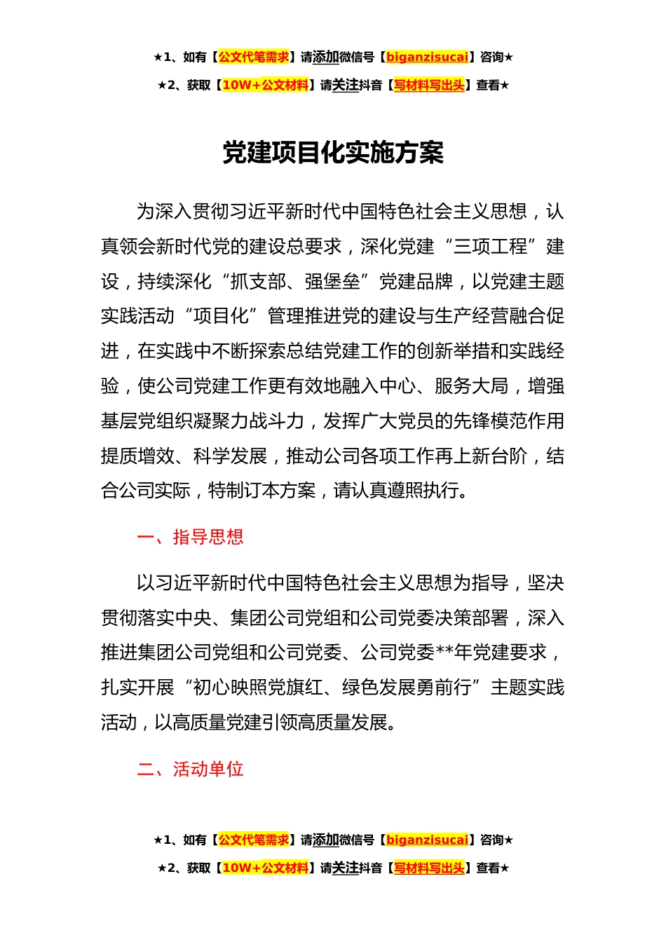 ★1、如有【公文代笔需求】请添加微信号【biganzisucai】咨询★★2、获取【10W+公文材料】请关注抖音【写材料写出头】查看★党建项目化实施方案为深入贯彻习近平新时代中国特色社会主义思想,认真领会新时代党的建设总要求,深化党建“三项工程”建设,持续深化“抓支部、强堡垒”党建品牌,以党建主题实践活动“项目化”管理推进党的建设与生产经营融合促进,在实践中不断探索总结党建工作的创新举措和实践经验,使公司党建工作更有效地融入中心、服务大局,增强基层党组织凝聚力战斗力,发挥广大党员的先锋模范作用提质增效、科学发展,推动公司各项工作再上新台阶,结合公司实际,特制订本方案,请认真遵照执行。一、指导思想以习近平新时代中国特色社会主义思想为指导,坚决贯彻落实中央、集团公司党组和公司...
