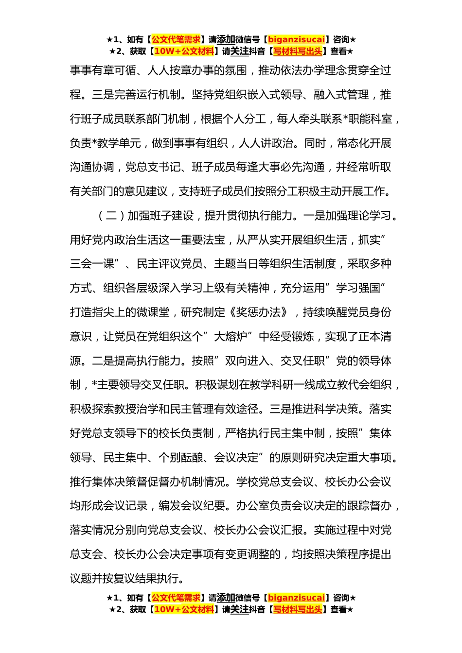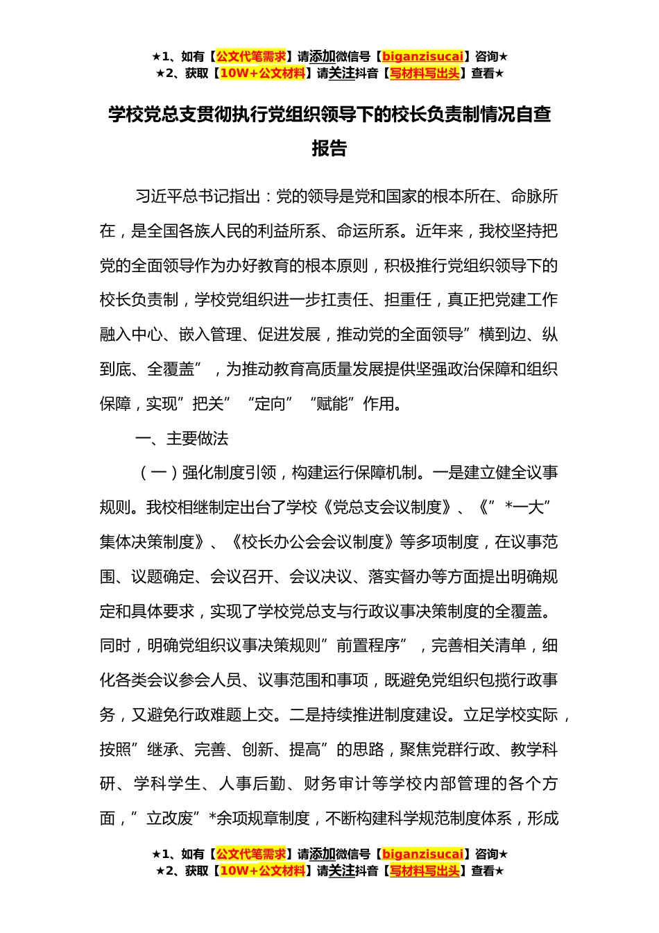 ★1、如有【公文代笔需求】请添加微信号【biganzisucai】咨询★★2、获取【10W+公文材料】请关注抖音【写材料写出头】查看★学校党总支贯彻执行党组织领导下的校长负责制情况自查报告习近平总书记指出:党的领导是党和国家的根本所在、命脉所在,是全国各族人民的利益所系、命运所系。近年来,我校坚持把党的全面领导作为办好教育的根本原则,积极推行党组织领导下的校长负责制,学校党组织进一步扛责任、担重任,真正把党建工作融入中心、嵌入管理、促进发展,推动党的全面领导”横到边、纵到底、全覆盖”,为推动教育高质量发展提供坚强政治保障和组织保障,实现”把关”“定向”“赋能”作用。一、主要做法(一)强化制度引领,构建运行保障机制。一是建立健全议事规则。我校相继制定出台了学校《党总支会议制...