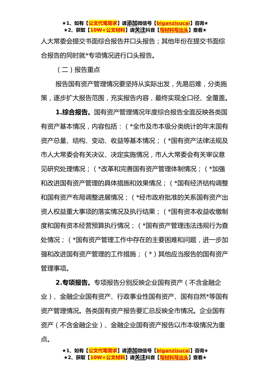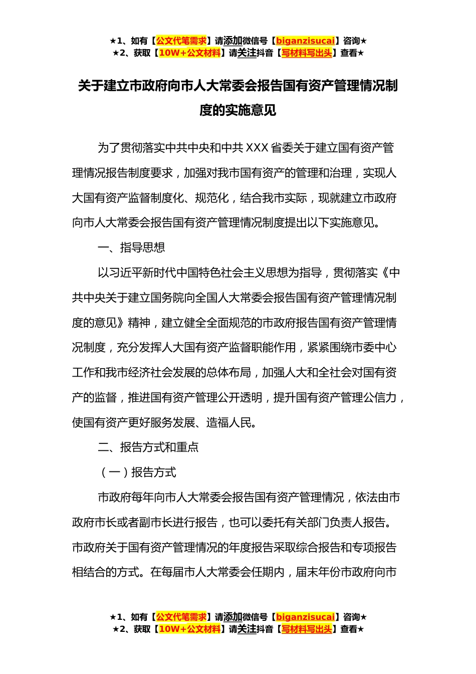 ★1、如有【公文代笔需求】请添加微信号【biganzisucai】咨询★★2、获取【10W+公文材料】请关注抖音【写材料写出头】查看★关于建立市政府向市人大常委会报告国有资产管理情况制度的实施意见为了贯彻落实中共中央和中共XXX省委关于建立国有资产管理情况报告制度要求,加强对我市国有资产的管理和治理,实现人大国有资产监督制度化、规范化,结合我市实际,现就建立市政府向市人大常委会报告国有资产管理情况制度提出以下实施意见。一、指导思想以习近平新时代中国特色社会主义思想为指导,贯彻落实《中共中央关于建立国务院向全国人大常委会报告国有资产管理情况制度的意见》精神,建立健全全面规范的市政府报告国有资产管理情况制度,充分发挥人大国有资产监督职能作用,紧紧围绕市委中心工作和我市经济社会发展...
