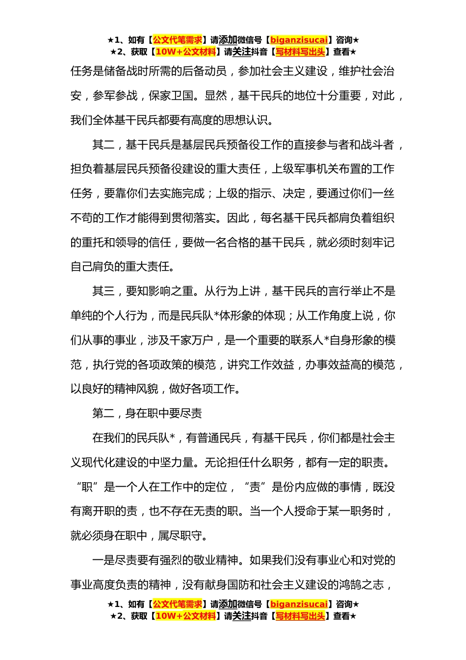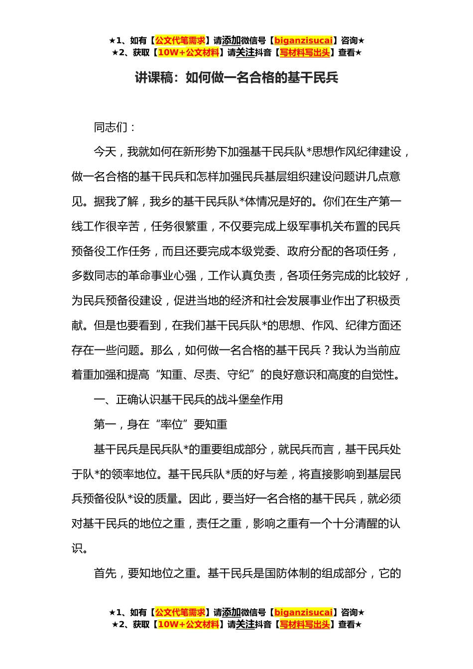★1、如有【公文代笔需求】请添加微信号【biganzisucai】咨询★★2、获取【10W+公文材料】请关注抖音【写材料写出头】查看★讲课稿:如何做一名合格的基干民兵同志们:今天,我就如何在新形势下加强基干民兵队*思想作风纪律建设,做一名合格的基干民兵和怎样加强民兵基层组织建设问题讲几点意见。据我了解,我乡的基干民兵队*体情况是好的。你们在生产第一线工作很辛苦,任务很繁重,不仅要完成上级军事机关布置的民兵预备役工作任务,而且还要完成本级党委、政府分配的各项任务,多数同志的革命事业心强,工作认真负责,各项任务完成的比较好,为民兵预备役建设,促进当地的经济和社会发展事业作出了积极贡献。但是也要看到,在我们基干民兵队*的思想、作风、纪律方面还存在一些问题。那么,如何做一名合格的基干...