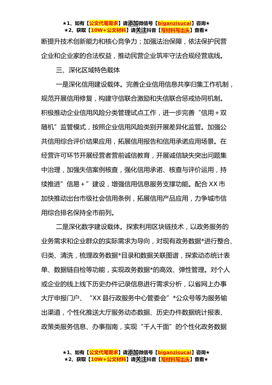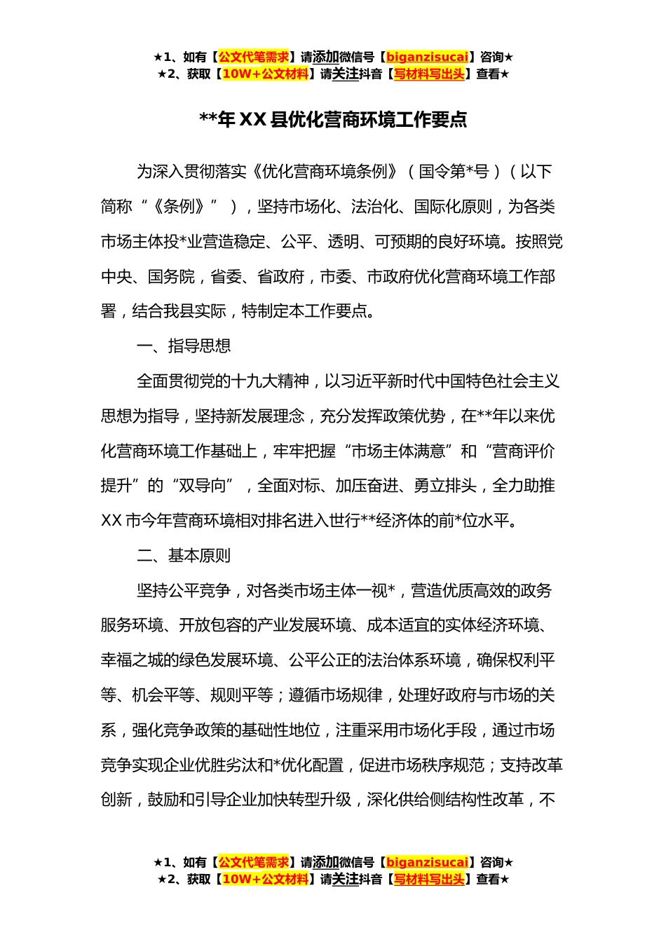 ★1、如有【公文代笔需求】请添加微信号【biganzisucai】咨询★★2、获取【10W+公文材料】请关注抖音【写材料写出头】查看★**年XX县优化营商环境工作要点为深入贯彻落实《优化营商环境条例》(国令第*号)(以下简称“《条例》”),坚持市场化、法治化、国际化原则,为各类市场主体投*业营造稳定、公平、透明、可预期的良好环境。按照党中央、国务院,省委、省政府,市委、市政府优化营商环境工作部署,结合我县实际,特制定本工作要点。一、指导思想全面贯彻党的十九大精神,以习近平新时代中国特色社会主义思想为指导,坚持新发展理念,充分发挥政策优势,在**年以来优化营商环境工作基础上,牢牢把握“市场主体满意”和“营商评价提升”的“双导向”,全面对标、加压奋进、勇立排头,全力助推XX市今年营商环...