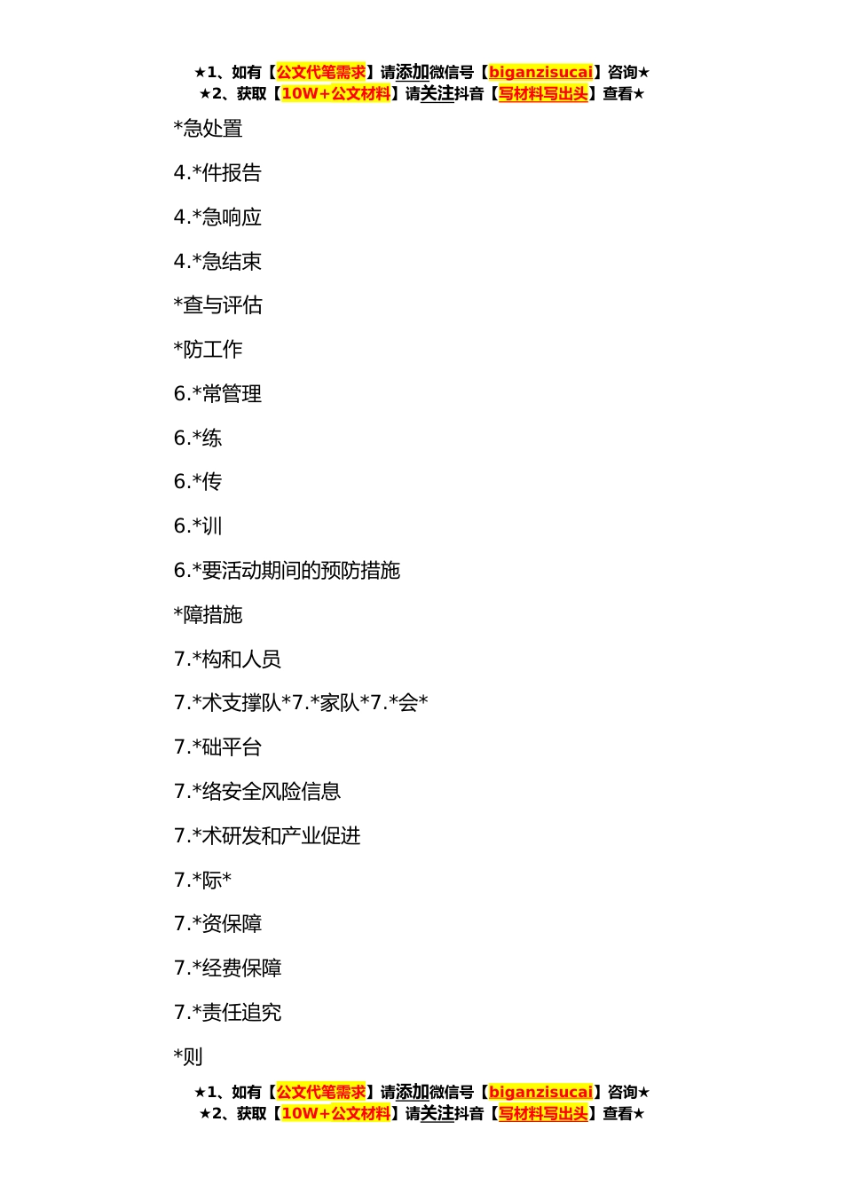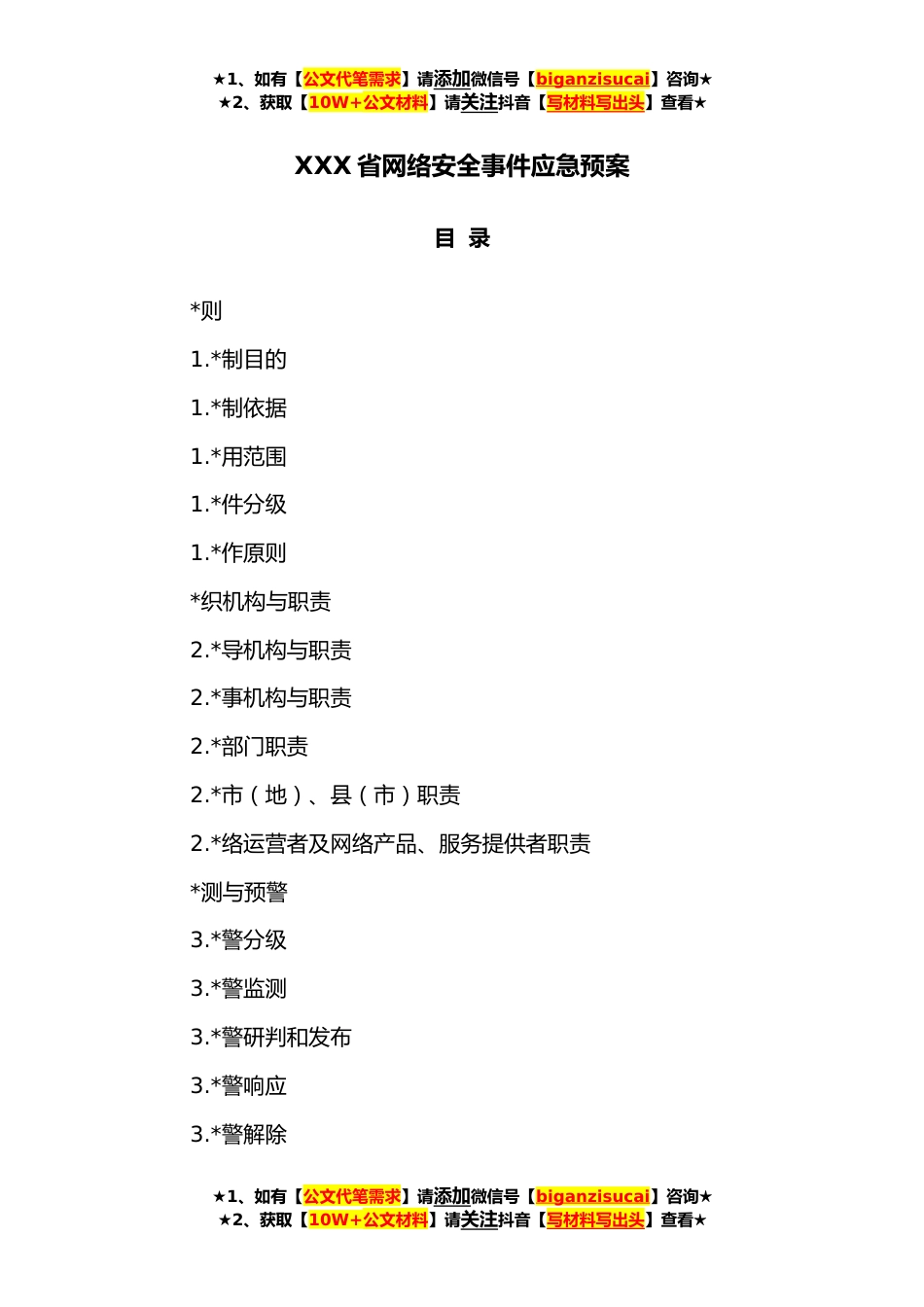 ★1、如有【公文代笔需求】请添加微信号【biganzisucai】咨询★★2、获取【10W+公文材料】请关注抖音【写材料写出头】查看★XXX省网络安全事件应急预案目录*则1.*制目的1.*制依据1.*用范围1.*件分级1.*作原则*织机构与职责2.*导机构与职责2.*事机构与职责2.*部门职责2.*市(地)、县(市)职责2.*络运营者及网络产品、服务提供者职责*测与预警3.*警分级3.*警监测3.*警研判和发布3.*警响应3.*警解除★1、如有【公文代笔需求】请添加微信号【biganzisucai】咨询★★2、获取【10W+公文材料】请关注抖音【写材料写出头】查看★★1、如有【公文代笔需求】请添加微信号【biganzisucai】咨询★★2、获取【10W+公文材料】请关注抖音【写材料写出头】查看★*急处置4.*件报告4.*急响应4.*急结束*查与评估*防工作6.*常管理6.*...