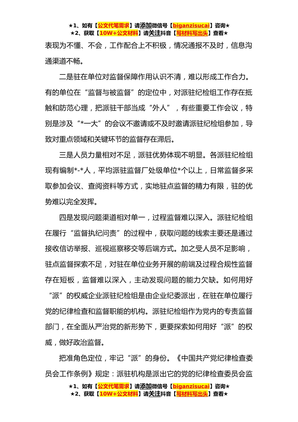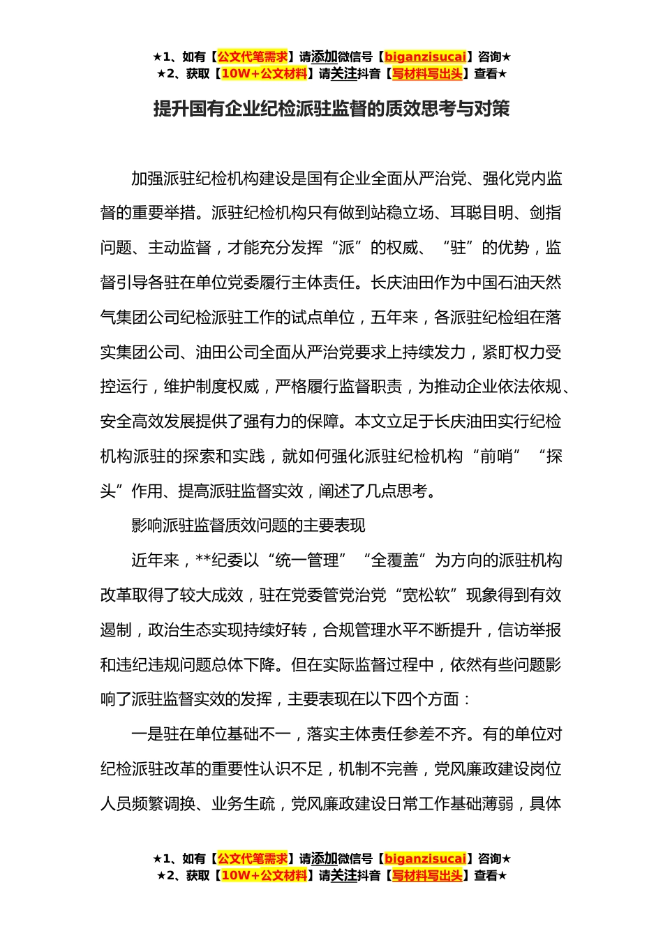 ★1、如有【公文代笔需求】请添加微信号【biganzisucai】咨询★★2、获取【10W+公文材料】请关注抖音【写材料写出头】查看★提升国有企业纪检派驻监督的质效思考与对策加强派驻纪检机构建设是国有企业全面从严治党、强化党内监督的重要举措。派驻纪检机构只有做到站稳立场、耳聪目明、剑指问题、主动监督,才能充分发挥“派”的权威、“驻”的优势,监督引导各驻在单位党委履行主体责任。长庆油田作为中国石油天然气集团公司纪检派驻工作的试点单位,五年来,各派驻纪检组在落实集团公司、油田公司全面从严治党要求上持续发力,紧盯权力受控运行,维护制度权威,严格履行监督职责,为推动企业依法依规、安全高效发展提供了强有力的保障。本文立足于长庆油田实行纪检机构派驻的探索和实践,就如何强化派驻纪检机构...