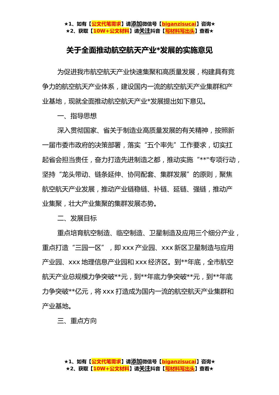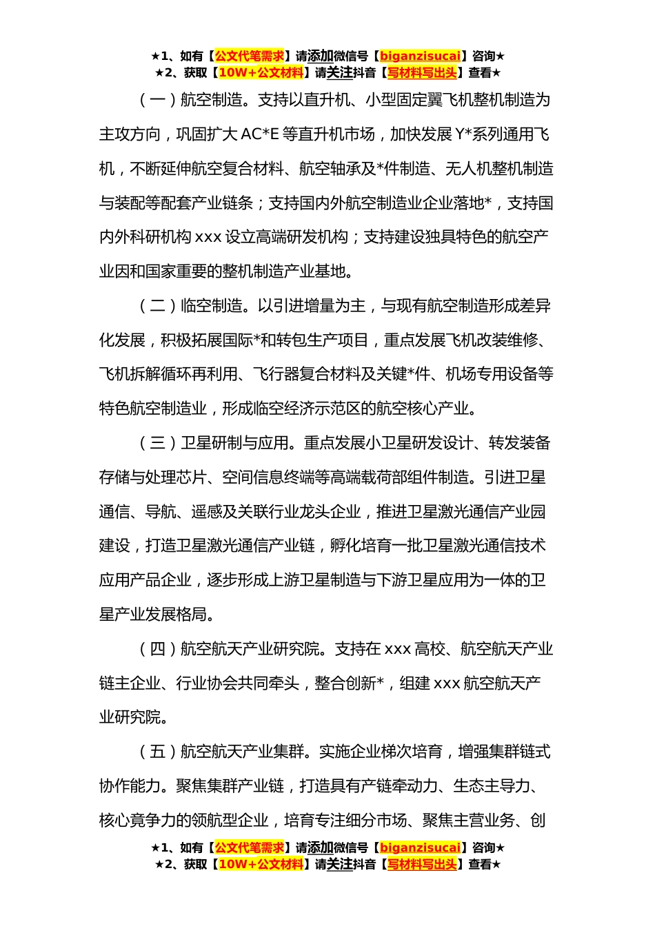 ★1、如有【公文代笔需求】请添加微信号【biganzisucai】咨询★★2、获取【10W+公文材料】请关注抖音【写材料写出头】查看★关于全面推动航空航天产业*发展的实施意见为促进我市航空航天产业快速集聚和高质量发展,构建具有竞争力的航空航天产业体系,建设国内一流的航空航天产业集群和产业基地,现就全面推动航空航天产业*发展提出如下意见。一、指导思想深入贯彻国家、省关于制造业高质量发展的有关精神,按照新一届市委市政府的决策部署,落实“五个率先”工作要求,切实扛起省会担当贵任,奋力打造先进制造之都,推动实施“**"专项行动,坚持“龙头带动、链条延伸、协同配套、集群发展”的原则,聚焦航空航天产业发展,推动产业链稳链、补链、延链、强链,推动产业集聚,壮大产业集聚的集群发展态势。二、发展...