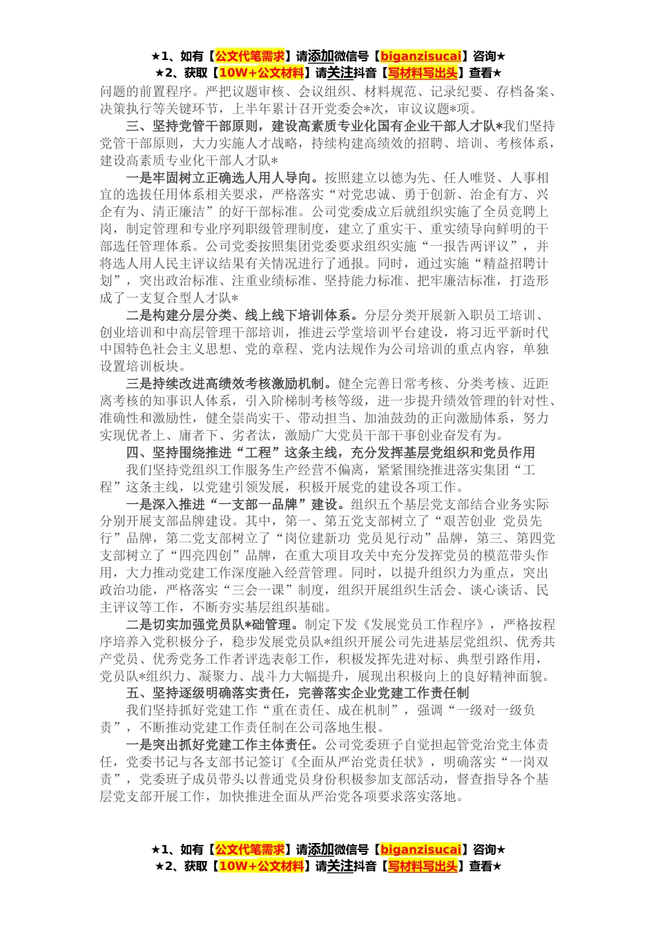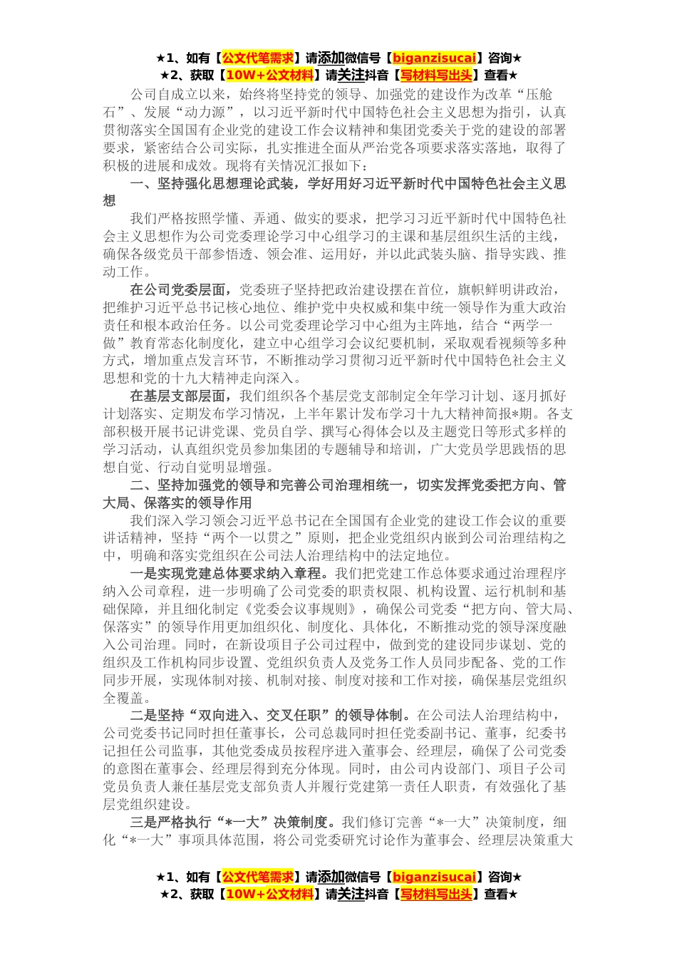 ★1、如有【公文代笔需求】请添加微信号【biganzisucai】咨询★★2、获取【10W+公文材料】请关注抖音【写材料写出头】查看★公司自成立以来,始终将坚持党的领导、加强党的建设作为改革“压舱石”、发展“动力源”,以习近平新时代中国特色社会主义思想为指引,认真贯彻落实全国国有企业党的建设工作会议精神和集团党委关于党的建设的部署要求,紧密结合公司实际,扎实推进全面从严治党各项要求落实落地,取得了积极的进展和成效。现将有关情况汇报如下:一、坚持强化思想理论武装,学好用好习近平新时代中国特色社会主义思想我们严格按照学懂、弄通、做实的要求,把学习习近平新时代中国特色社会主义思想作为公司党委理论学习中心组学习的主课和基层组织生活的主线,确保各级党员干部参悟透、领会准、运用好,并...