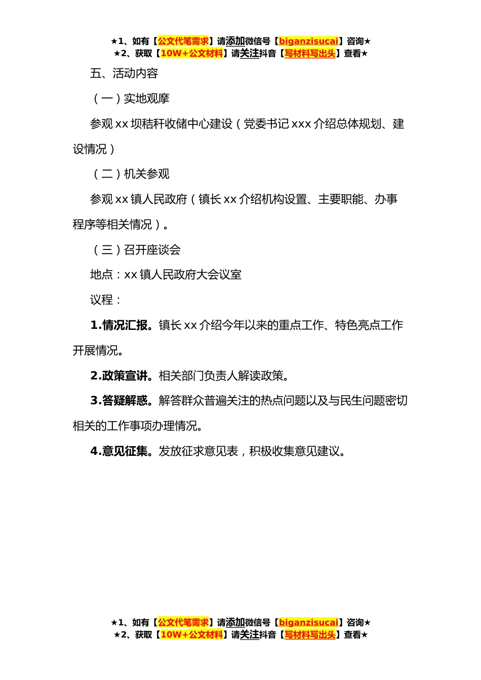 ★1、如有【公文代笔需求】请添加微信号【biganzisucai】咨询★★2、获取【10W+公文材料】请关注抖音【写材料写出头】查看★xx镇**年“政务开放日”活动实施方案为切实推进阳光、透明、开放、服务型政府建设,加快法治政府、保障人民群众的知情权、表达权、参与权和监督权,全面推进基层政务公开工作,提升政务公开工作水平。按照《xx县人民政府办公室关于开展**年“政务开放日”活动的通知》(x府办〔**〕xx号)要求,结合我镇实际,特制定本方案。一、总体目标按照依法行政、科学行政、民主行*阳光行政的要求,以公开透明为原则,以政民互动为基本形式,以服务群众为目标,积极推进开放式行政治理,使政府更加富有公信力、凝聚力和执行力。通过开展“政务开放日”活动,搭建政府与群众之间的沟通桥梁,增进彼此...