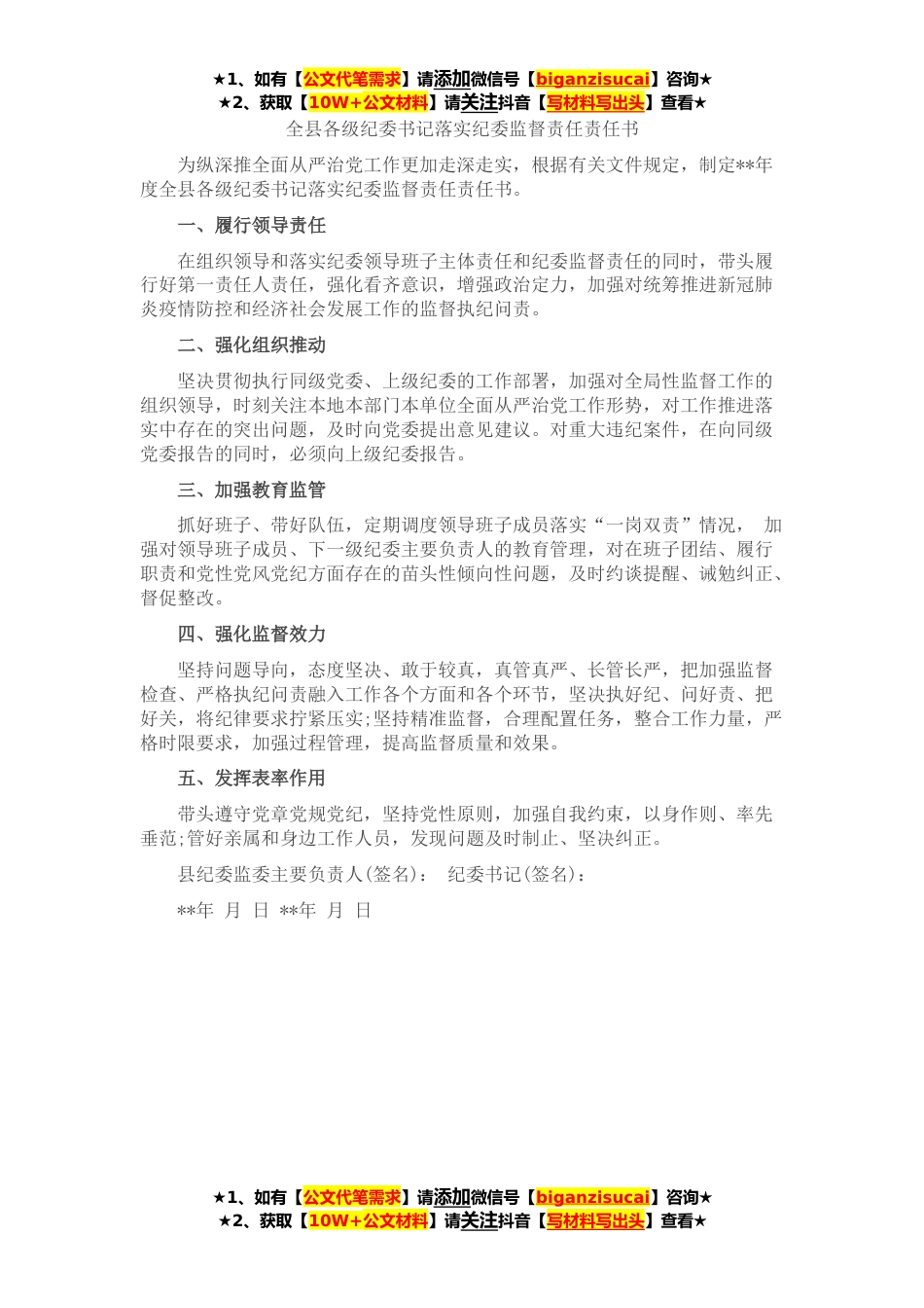★1、如有【公文代笔需求】请添加微信号【biganzisucai】咨询★★2、获取【10W+公文材料】请关注抖音【写材料写出头】查看★全县各级纪委书记落实纪委监督责任责任书为纵深推全面从严治党工作更加走深走实,根据有关文件规定,制定**年度全县各级纪委书记落实纪委监督责任责任书。一、履行领导责任在组织领导和落实纪委领导班子主体责任和纪委监督责任的同时,带头履行好第一责任人责任,强化看齐意识,增强政治定力,加强对统筹推进新冠肺炎疫情防控和经济社会发展工作的监督执纪问责。二、强化组织推动坚决贯彻执行同级党委、上级纪委的工作部署,加强对全局性监督工作的组织领导,时刻关注本地本部门本单位全面从严治党工作形势,对工作推进落实中存在的突出问题,及时向党委提出意见建议。对重大违纪案件,在...