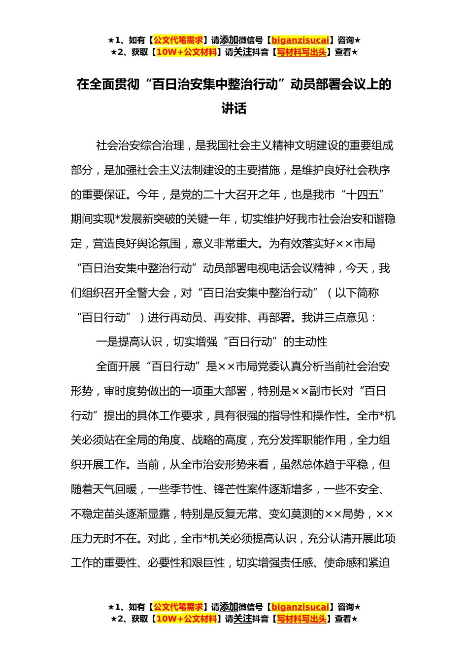 ★1、如有【公文代笔需求】请添加微信号【biganzisucai】咨询★★2、获取【10W+公文材料】请关注抖音【写材料写出头】查看★在全面贯彻“百日治安集中整治行动”动员部署会议上的讲话社会治安综合治理,是我国社会主义精神文明建设的重要组成部分,是加强社会主义法制建设的主要措施,是维护良好社会秩序的重要保证。今年,是党的二十大召开之年,也是我市“十四五”期间实现*发展新突破的关键一年,切实维护好我市社会治安和谐稳定,营造良好舆论氛围,意义非常重大。为有效落实好××市局“百日治安集中整治行动”动员部署电视电话会议精神,今天,我们组织召开全警大会,对“百日治安集中整治行动”(以下简称“百日行动”)进行再动员、再安排、再部署。我讲三点意见:一是提高认识,切实增强“百日行动”的主...
