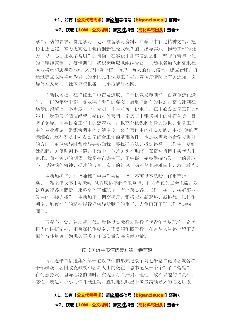 ★1、如有【公文代笔需求】请添加微信号【biganzisucai】咨询★★2、获取【10W+公文材料】请关注抖音【写材料写出头】查看★目录*习《习近平书信选集》第一卷有感**《习近平书信选集》第一卷有感**习近平书信选集》第一卷读书分享**《习近平的七年知青岁月》有感**一个女孩儿朝前走》读书分享**置身事内:中国政府与经济发展》读书分享**《火种:寻找中国*之路》有感*学习《习近平书信选集》第一卷有感通过近期对《习近平书信选集》第一卷的学习,我深刻领会到习近平总书记深邃厚重的思想魅力、博古通今的文化魅力、亲和质朴的人格魅力。这部书信选集,选入习近平总书记**年*至***月期间的书信共**,其中部分书信是首次公开发表。书信选集的内容,涉及新时代坚持和发展中国特色社会主义的各个领域各个方面,论及重...
