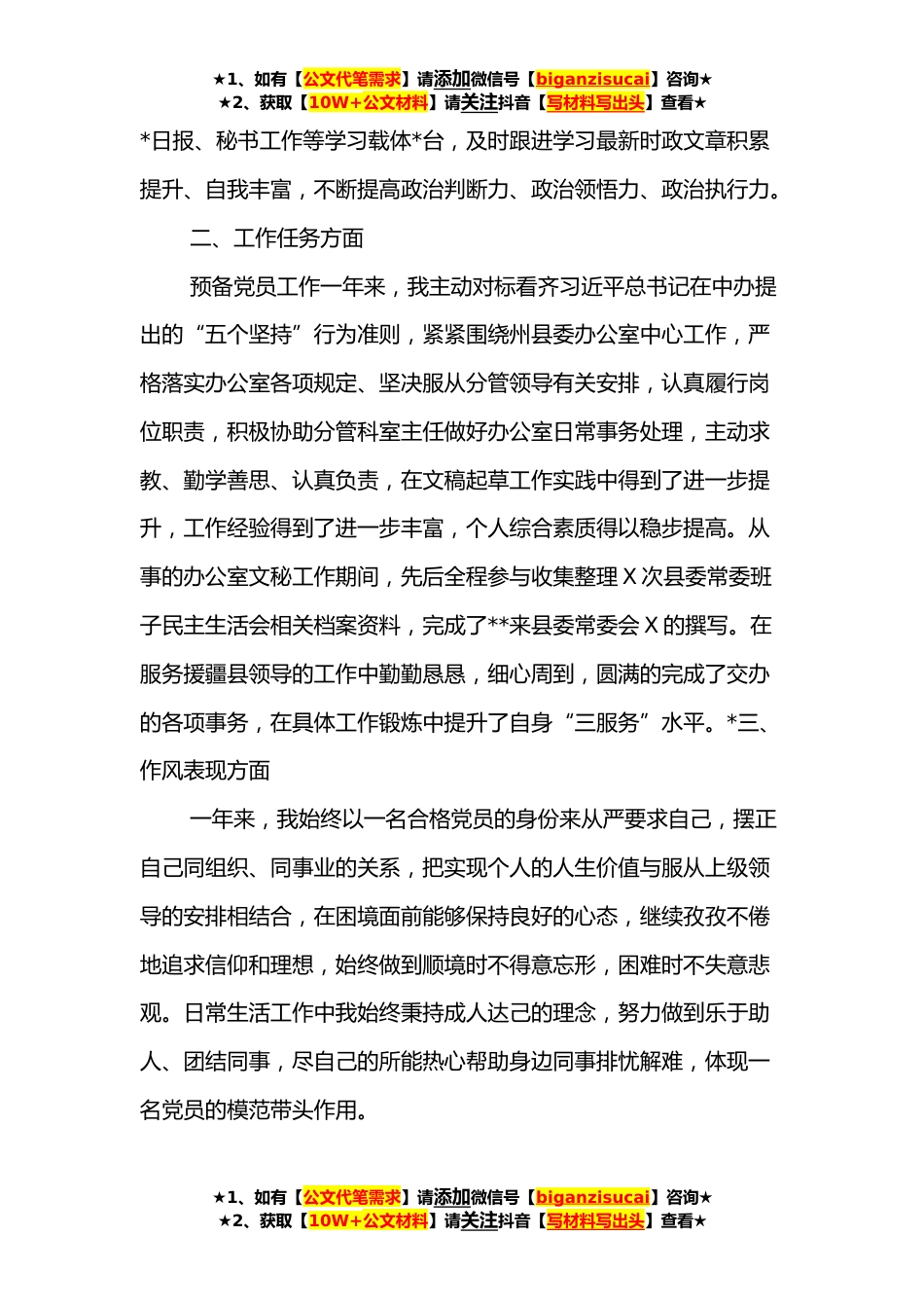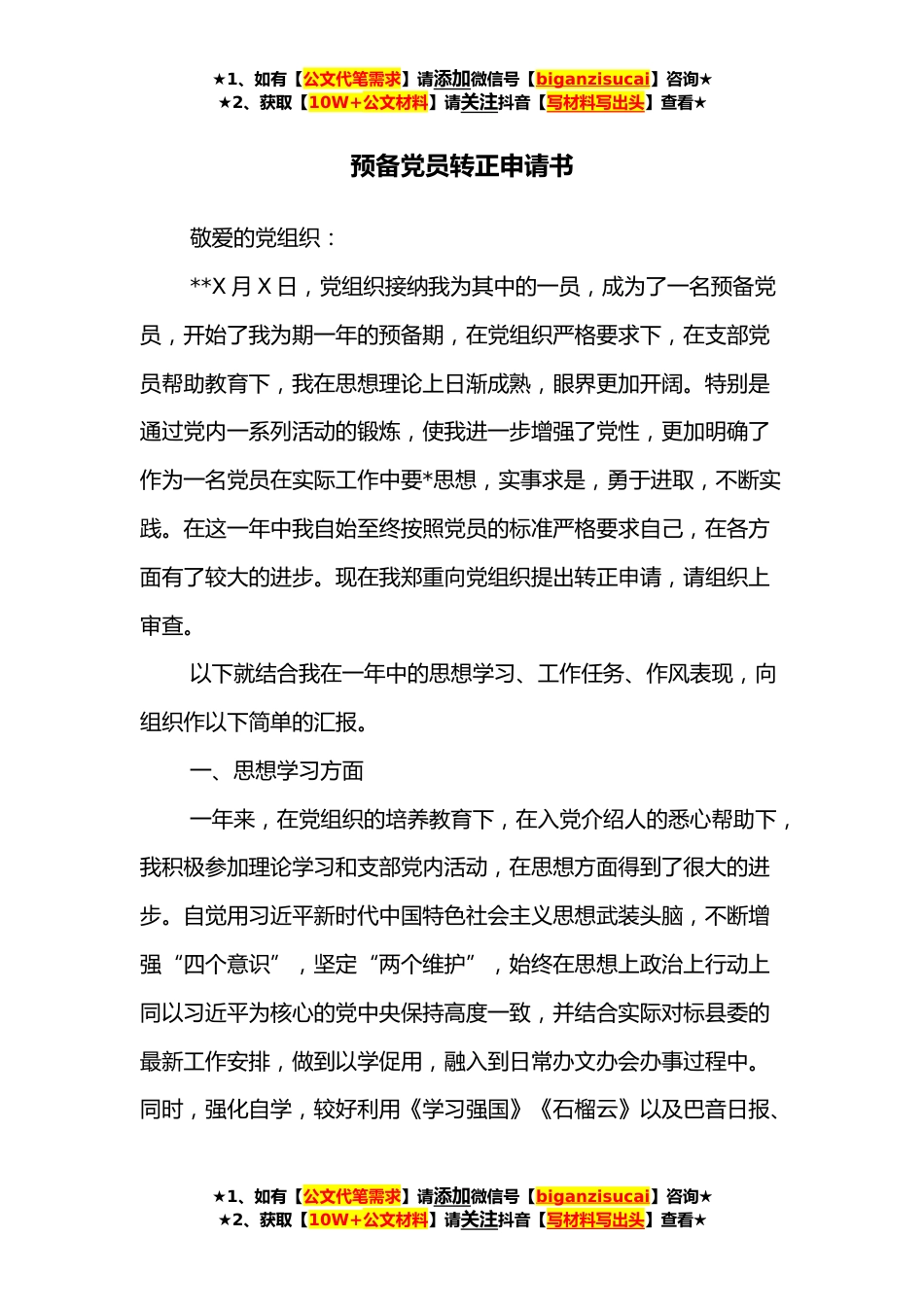 ★1、如有【公文代笔需求】请添加微信号【biganzisucai】咨询★★2、获取【10W+公文材料】请关注抖音【写材料写出头】查看★预备党员转正申请书敬爱的党组织:**X月X日,党组织接纳我为其中的一员,成为了一名预备党员,开始了我为期一年的预备期,在党组织严格要求下,在支部党员帮助教育下,我在思想理论上日渐成熟,眼界更加开阔。特别是通过党内一系列活动的锻炼,使我进一步增强了党性,更加明确了作为一名党员在实际工作中要*思想,实事求是,勇于进取,不断实践。在这一年中我自始至终按照党员的标准严格要求自己,在各方面有了较大的进步。现在我郑重向党组织提出转正申请,请组织上审查。以下就结合我在一年中的思想学习、工作任务、作风表现,向组织作以下简单的汇报。一、思想学习方面一年来,在党组织...