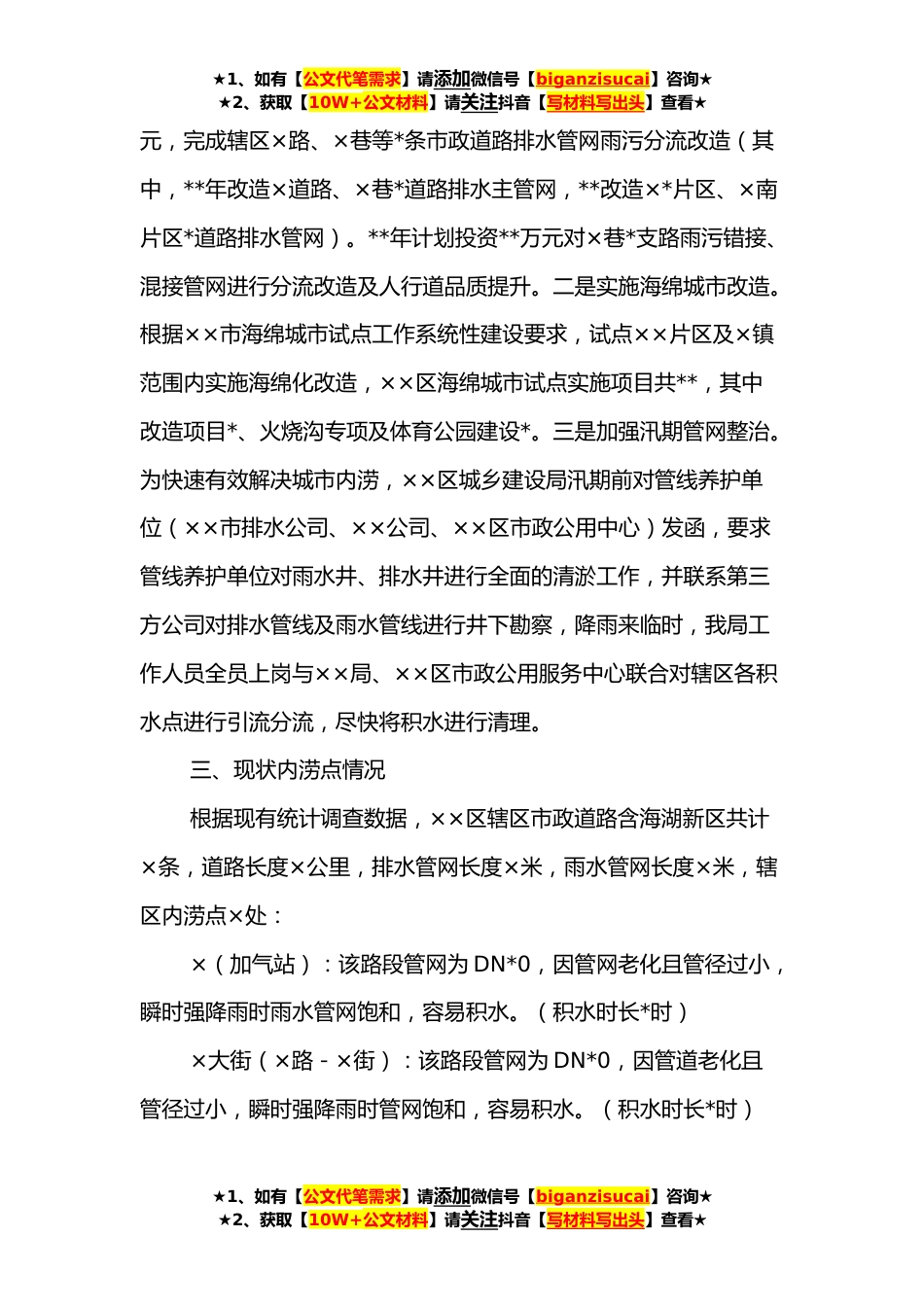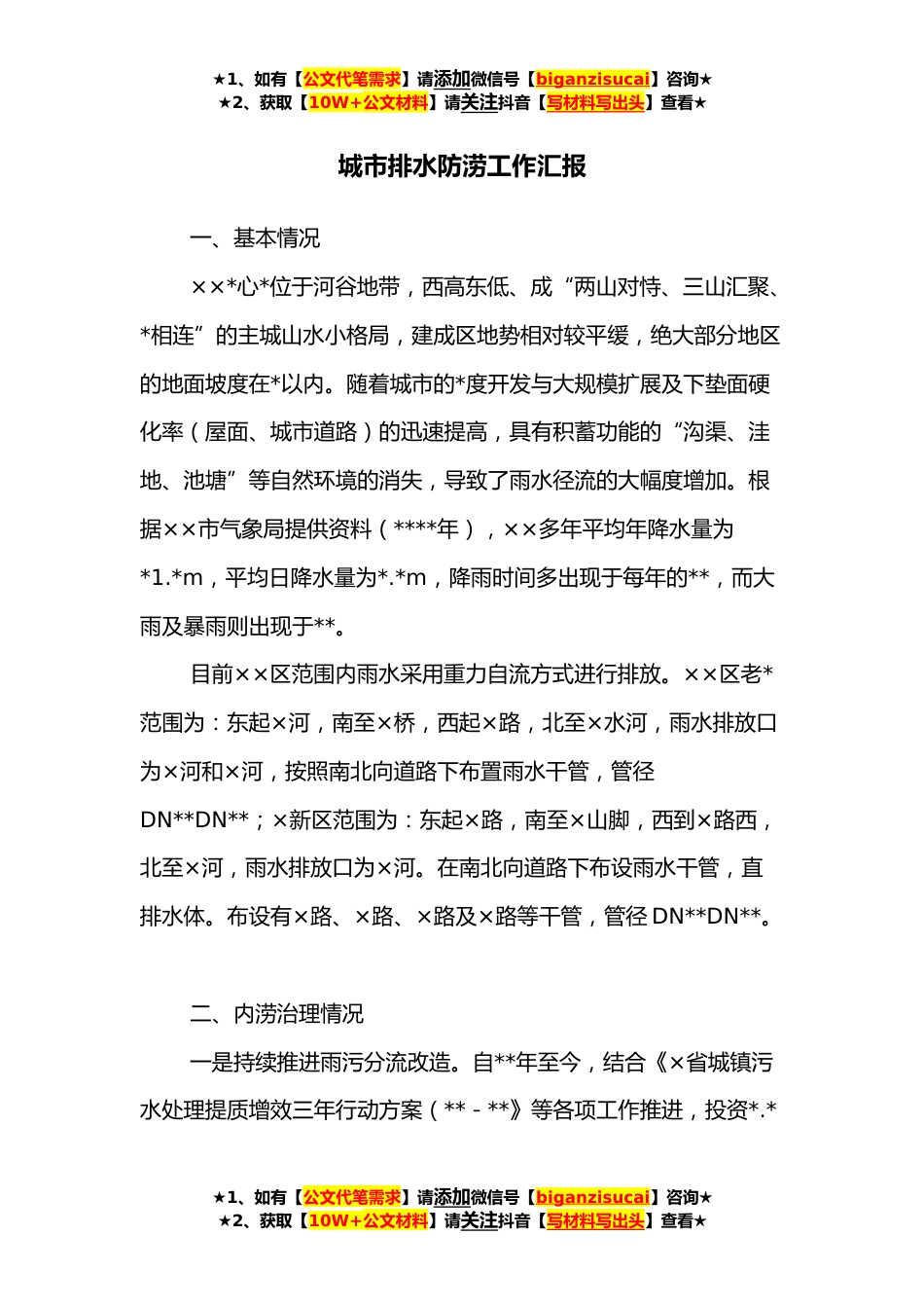 ★1、如有【公文代笔需求】请添加微信号【biganzisucai】咨询★★2、获取【10W+公文材料】请关注抖音【写材料写出头】查看★城市排水防涝工作汇报一、基本情况××*心*位于河谷地带,西高东低、成“两山对恃、三山汇聚、*相连”的主城山水小格局,建成区地势相对较平缓,绝大部分地区的地面坡度在*以内。随着城市的*度开发与大规模扩展及下垫面硬化率(屋面、城市道路)的迅速提高,具有积蓄功能的“沟渠、洼地、池塘”等自然环境的消失,导致了雨水径流的大幅度增加。根据××市气象局提供资料(****年),××多年平均年降水量为*1.*m,平均日降水量为*.*m,降雨时间多出现于每年的**,而大雨及暴雨则出现于**。目前××区范围内雨水采用重力自流方式进行排放。××区老*范围为:东起×河,南至×桥,西起×路,...